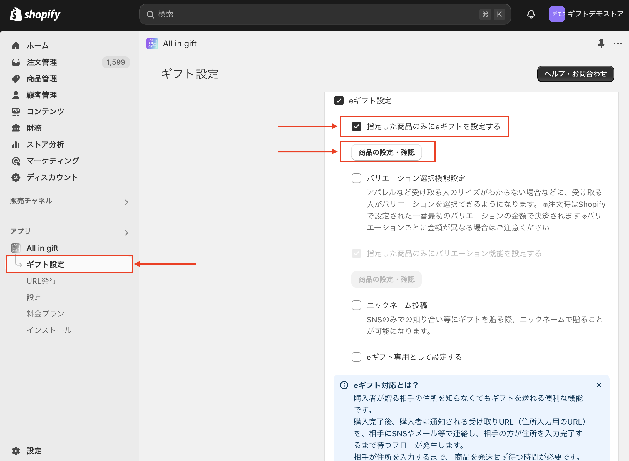 アプリ > All in gift > ギフト設定 > eギフト設定に進む