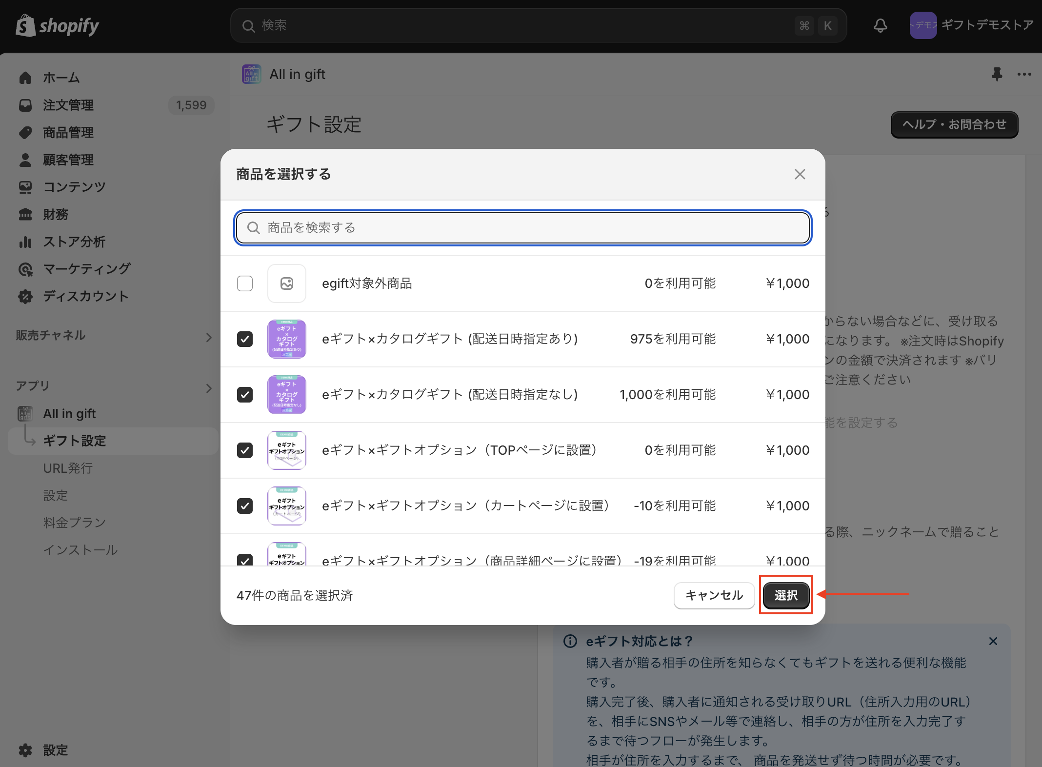 eギフトを適用させたい商品にチェックを入れ、選択ボタンをクリック