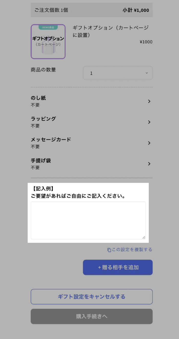 通常購入時はテーマ側のメモ欄を表示して問題ありません。ただし、購入者が 「ギフト配送を希望する」 または 「住所を知らない相手にeギフトで贈る」 を選択した場合のみ、テーマ側のメモ欄を非表示にする設定が必要です。