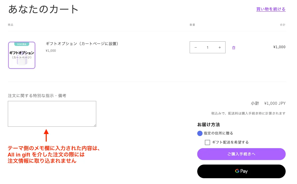 アプリの仕様上テーマ側のメモ欄に入力された内容はAll in gift経由の注文には反映されません。