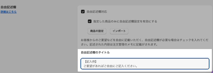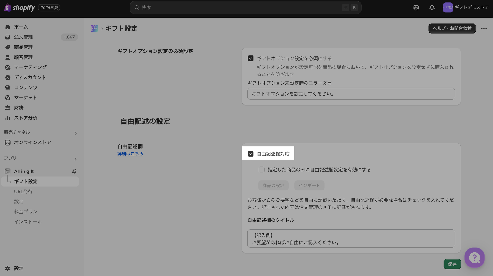 そのためメモ欄をご利用の場合は必ずAll in giftの自由記述欄を有効にしてください。