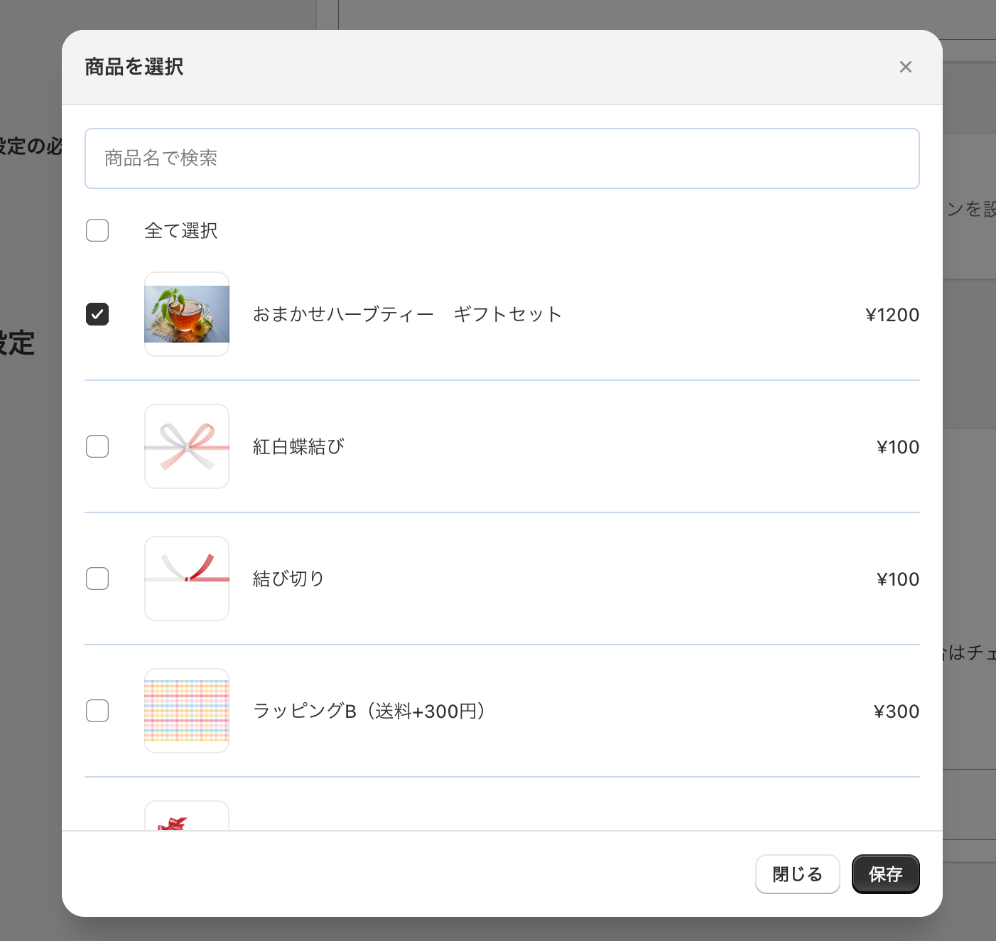1. 指定した商品のみに〇〇ギフトを有効にする > 商品の設定 から対象商品を選択をクリックする