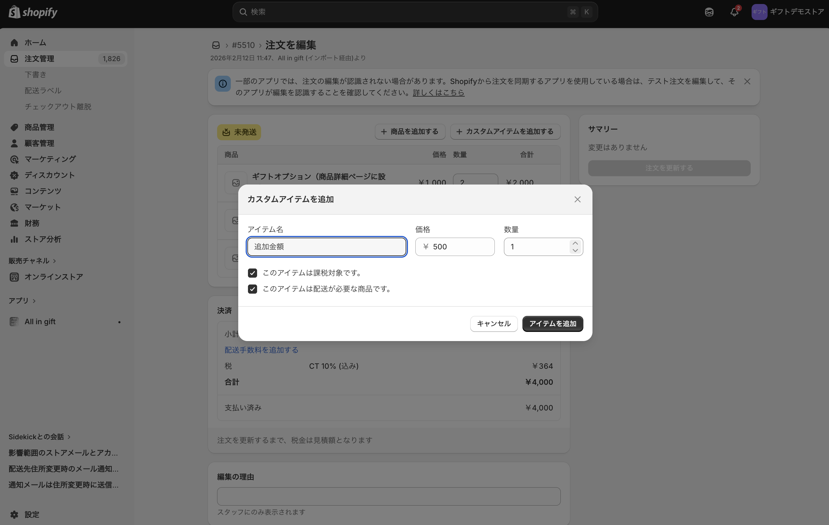 任意のアイテム名を入力 / 追加請求価格を入力