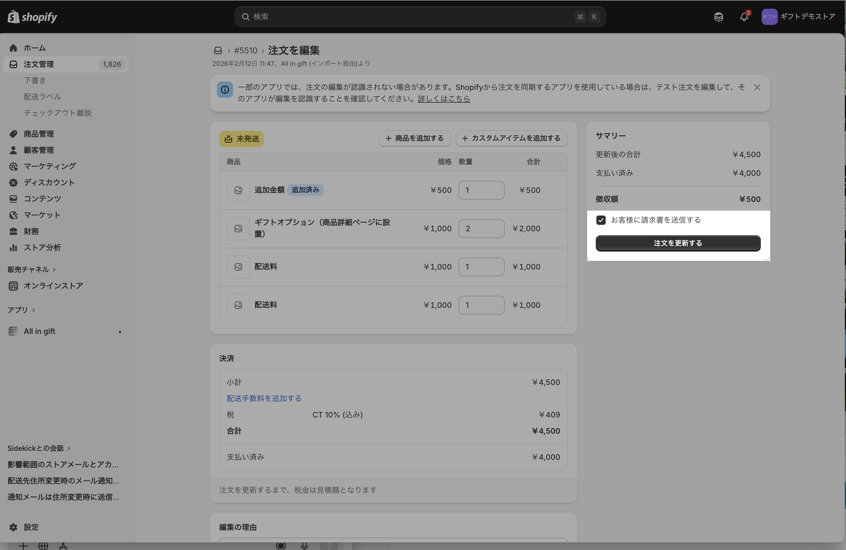 追加請求時、注文の編集画面に表示される 「お客様に請求書を送信する」 のチェック状態によって、請求書メールの送信有無が変わります。