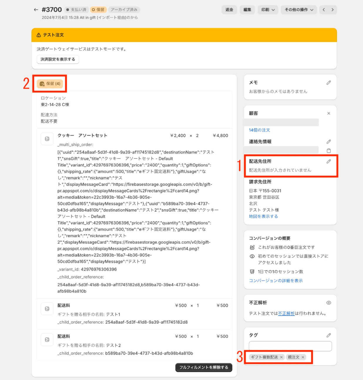 All in giftでは、複数配送機能を利用する際に、下記2つの注文が自動で作成されます。