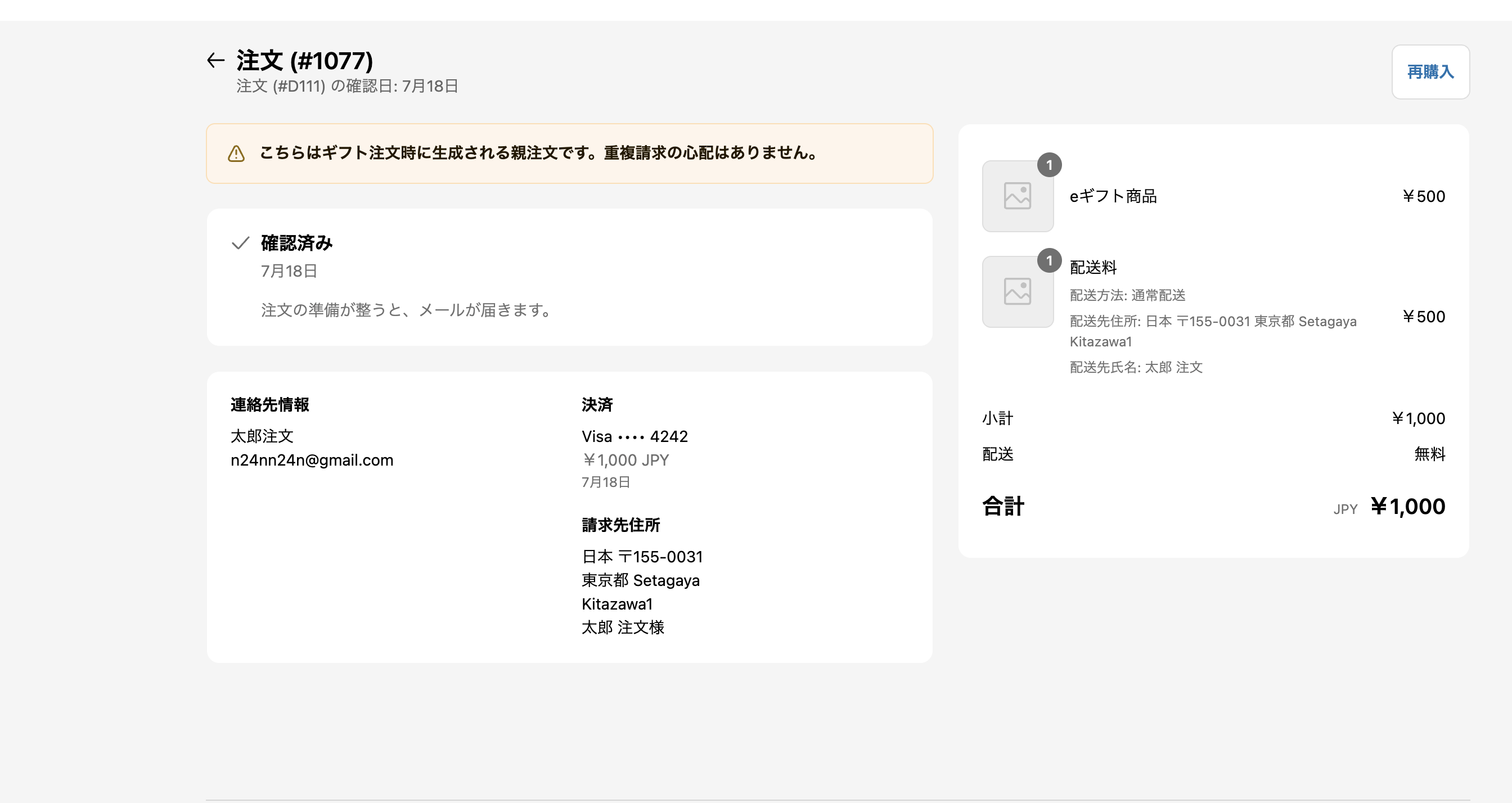 こちらはギフト注文時に生成される注文です。重複請求の心配はありません。