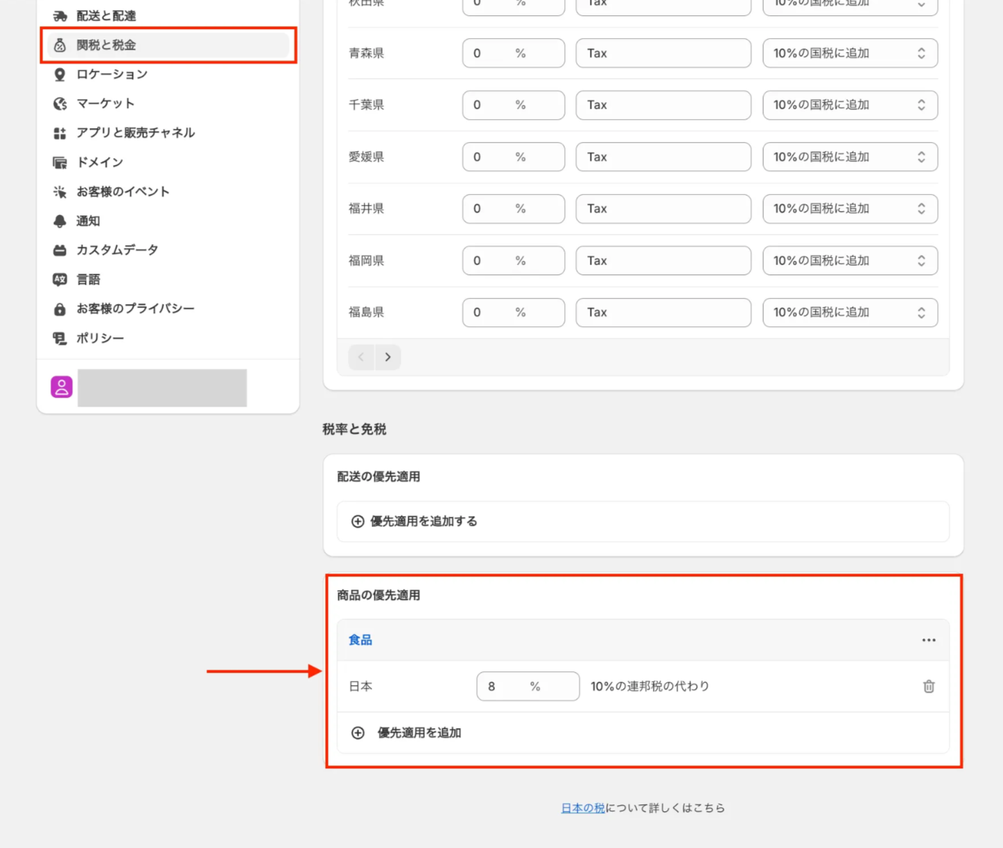 「複数配送機能」および「配送先住所入力をスキップする設定(eギフト固定送料含む)」を利用する場合、Shopifyの仕様上「デフォルト税率」が適用されます。