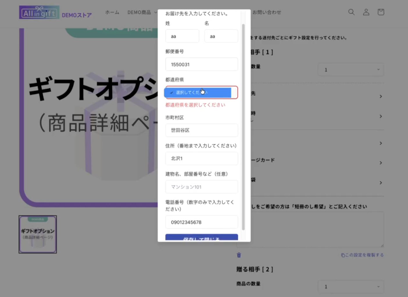 eギフト受け取りページの住所入力