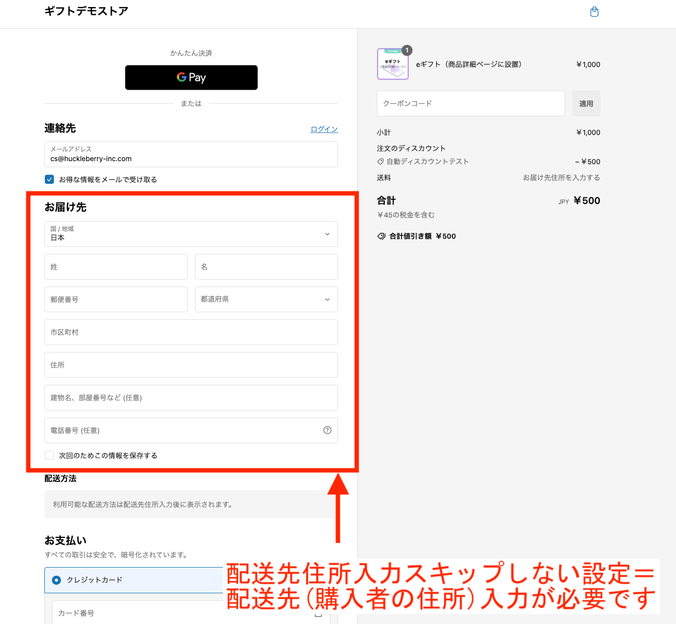 eギフト購入時に通常の購入フロー同様に「お届け先住所」の入力欄を表示する設定です。