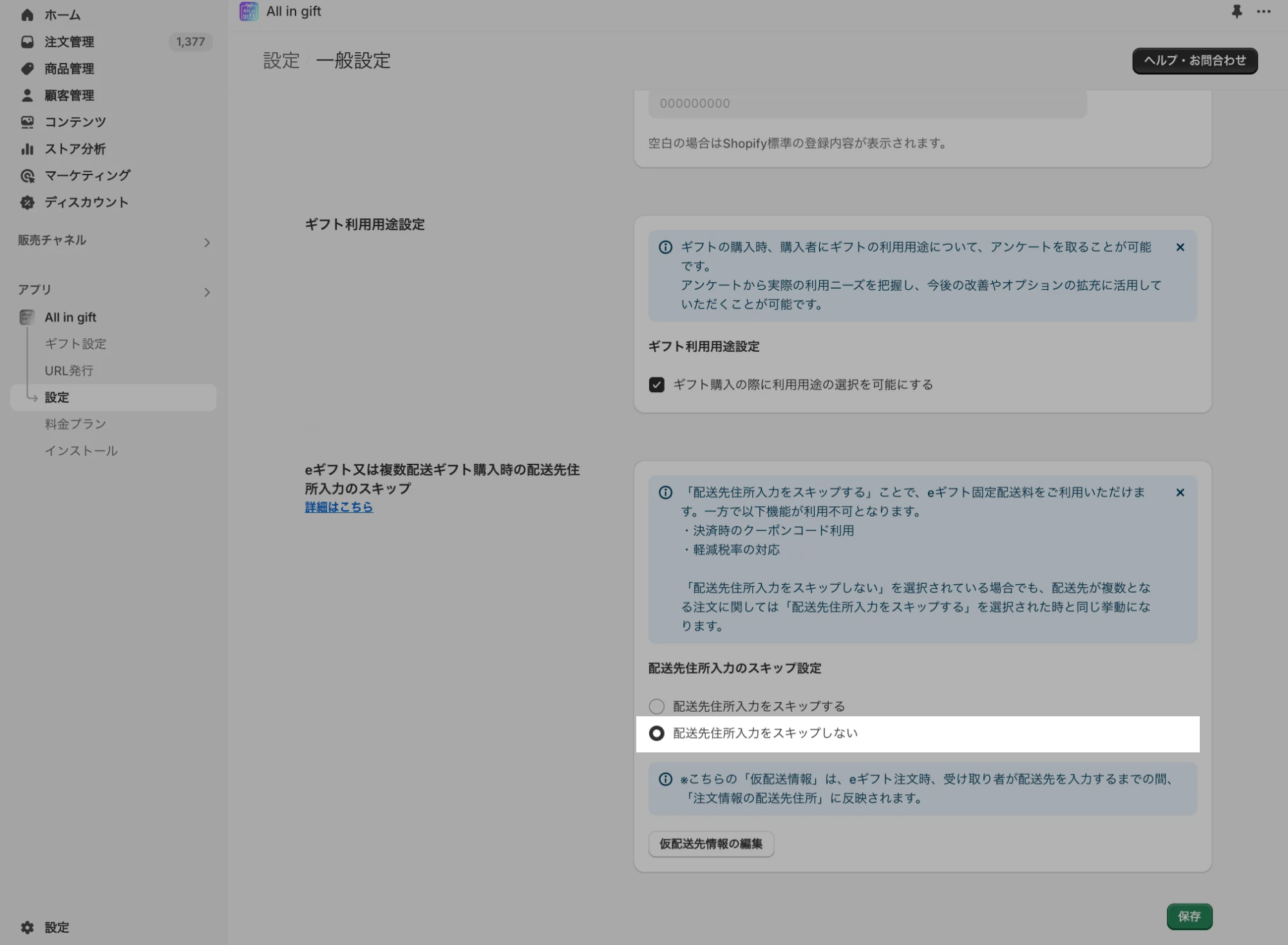 概要 --- eギフト又は複数配送ギフト購入時の配送先住所入力のスキップを「スキップしない」設定の際、「仮配送情報」が編集できます。 こちらで編集した「仮配送情報」は、eギフト注文時に受け取り者が配送先を入力するまでの間「注文情報の配送先住所」に反映されます。 ポイント --- 配送先住所入力をスキップしない場合、eギフト購入時点でのWMSへの住所連携を防ぐため、ダミー住所が取り込まれる仕様です。 設定方法 --- 1. アプリ > All in gift > 設定 > 一般設定 > eギフト又は複数配送ギフト購入時の配送先住所入力のスキップ > 配送先住所入力をスキップしない を選択 2. 仮配送先情報の編集 をクリックする 3. 注文管理画面 > 配送先住所欄に表示したい任意のテキストを入力 4. 保存後、必ず配送先住所入力をスキップしない にチェックが入っているか確認 5. 保存をクリックして設定完了です。 表示イメージ --- - 注文管理画面イメージ - 購入後サンキューページ表示イメージ(従来のチェックアウトをご利用の場合) - 購入後サンキューページ表示イメージ(新しいチ