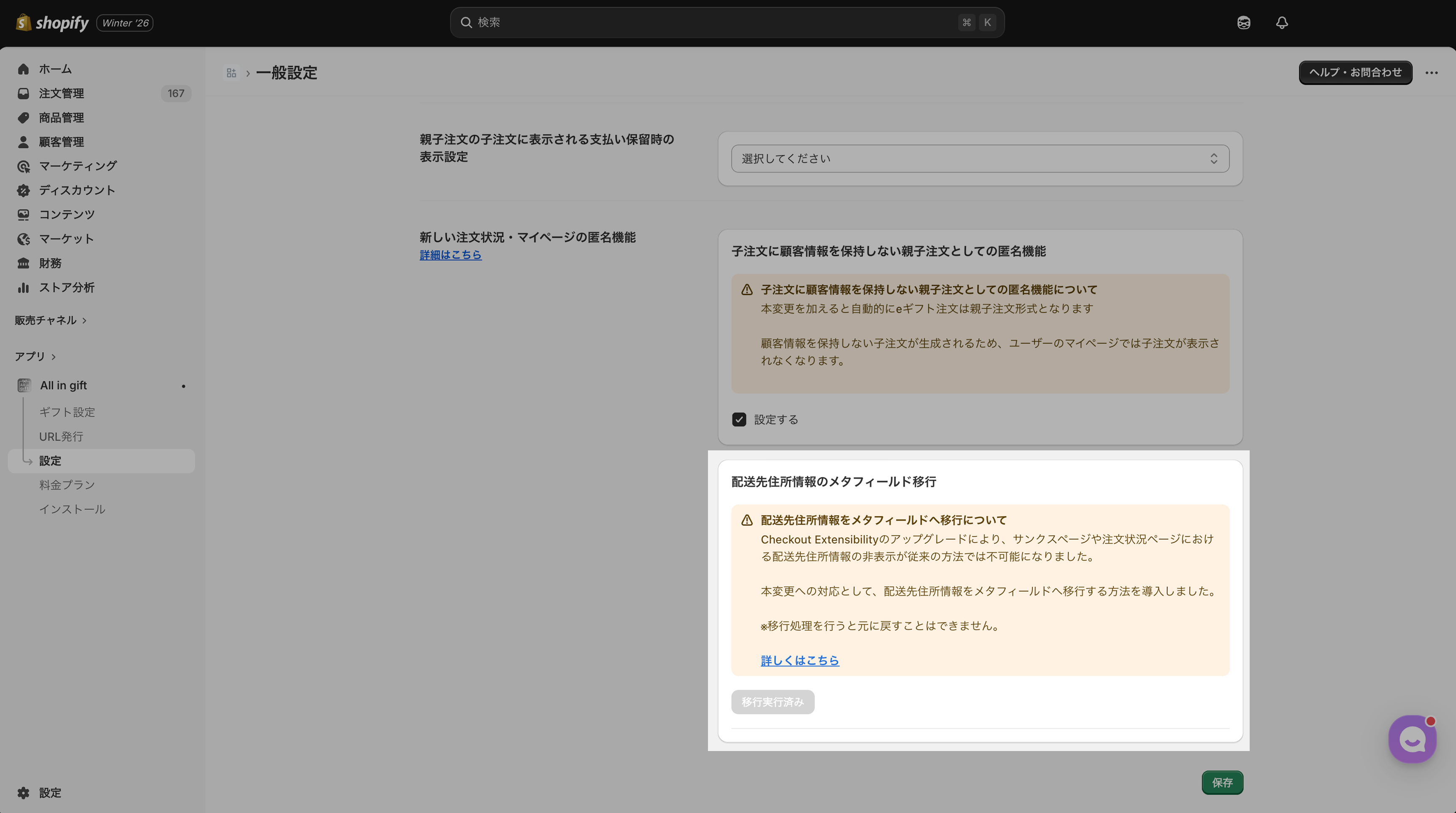 「配送先住所情報のメタフィールド移行」は、受取者が入力した配送先住所を Shopify のメタフィールドに保存し、注文管理画面には表示させないための仕組みです。