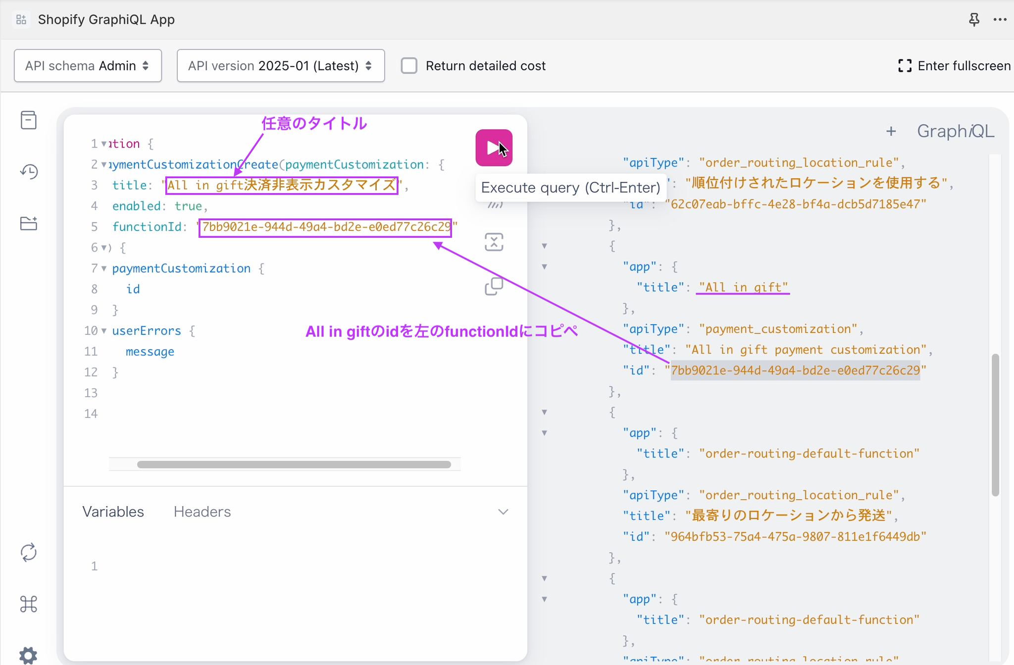 Shopify公式ドキュメントにあるstep3: Create the payment customization with GraphiQLの通り進めていきます
