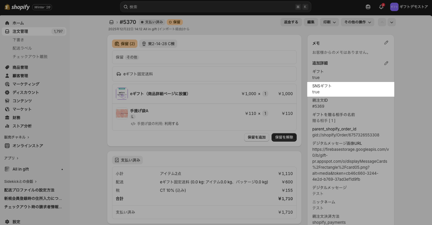 key:SNSギフトのvalueを確認true→eギフト注文として取り込まれていますfalse→All in gift ウィジェットを経由していない通常注文として処理されています