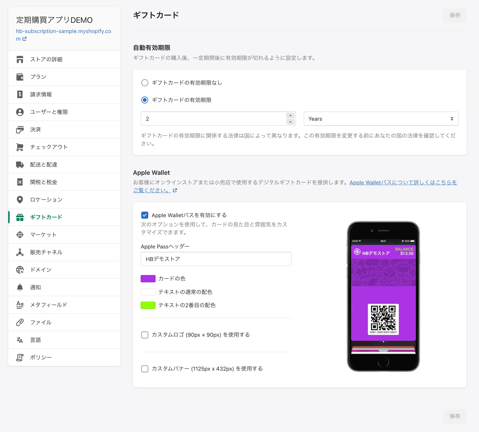 「設定」>「ギフトカード」 よりギフトカードの有効期限、Apple Walletの設定をします。