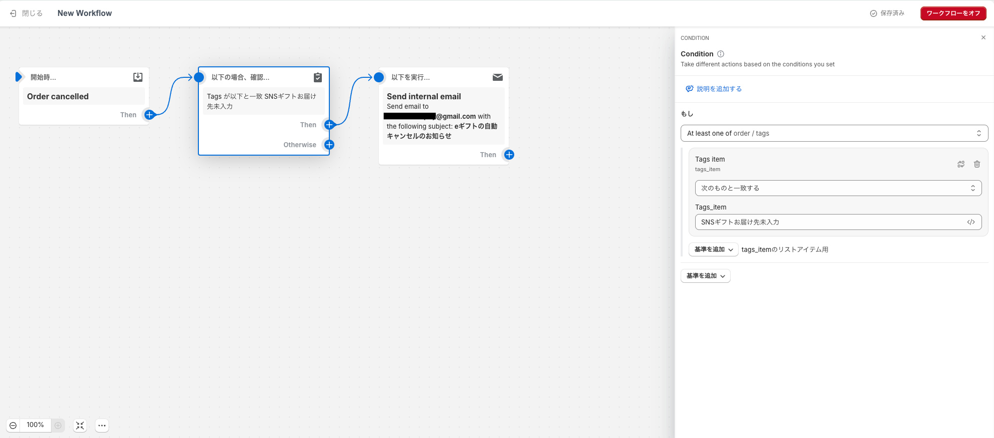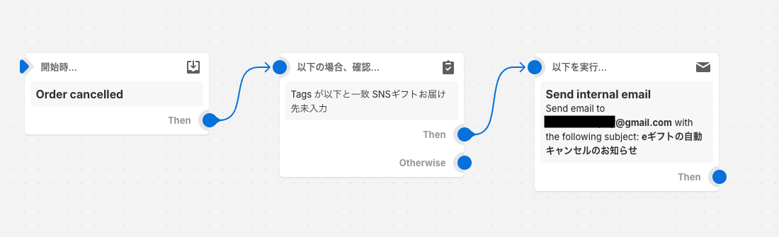 キャンセル時に決済システムにて手動での対応が必要な場合や、スタッフが自動キャンセルのタイミングを把握する必要がある場合に、以下のShopifyFlowの設定を推奨しております。