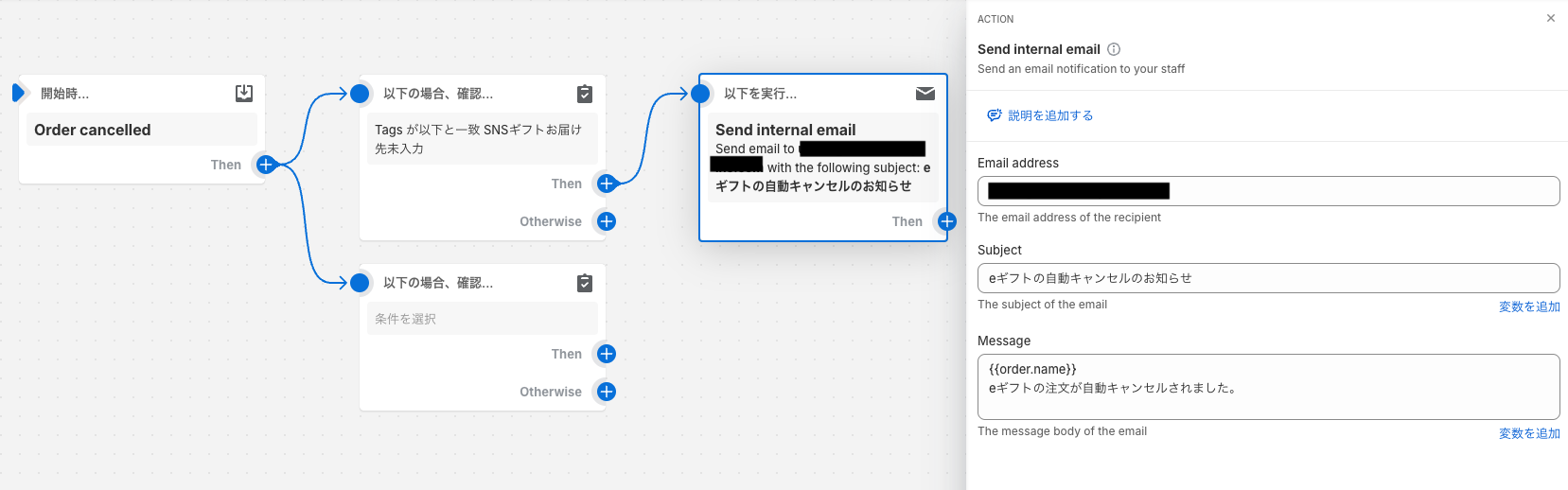 以下のように設定いただくことで、eギフト注文がキャンセルされた時に、特定のメールアドレスに通知することが可能です。