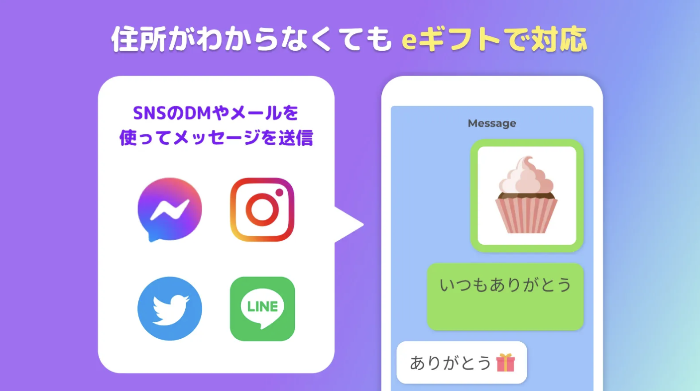 SNSやオンラインで知り合った友達にプレゼントを贈り、さらに良い関係を。デジタルメッセージカードもニックネームにして贈れるので安心。