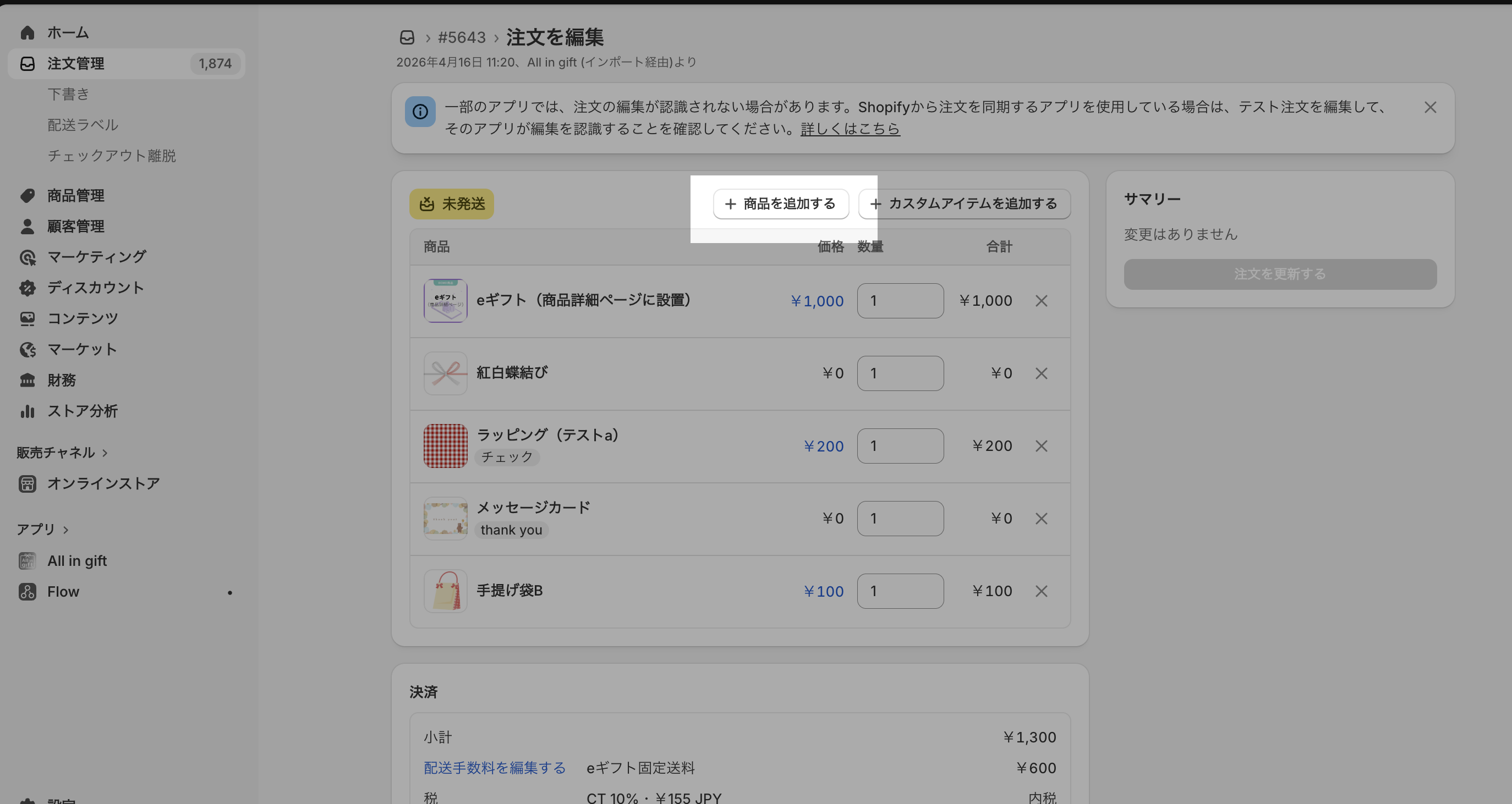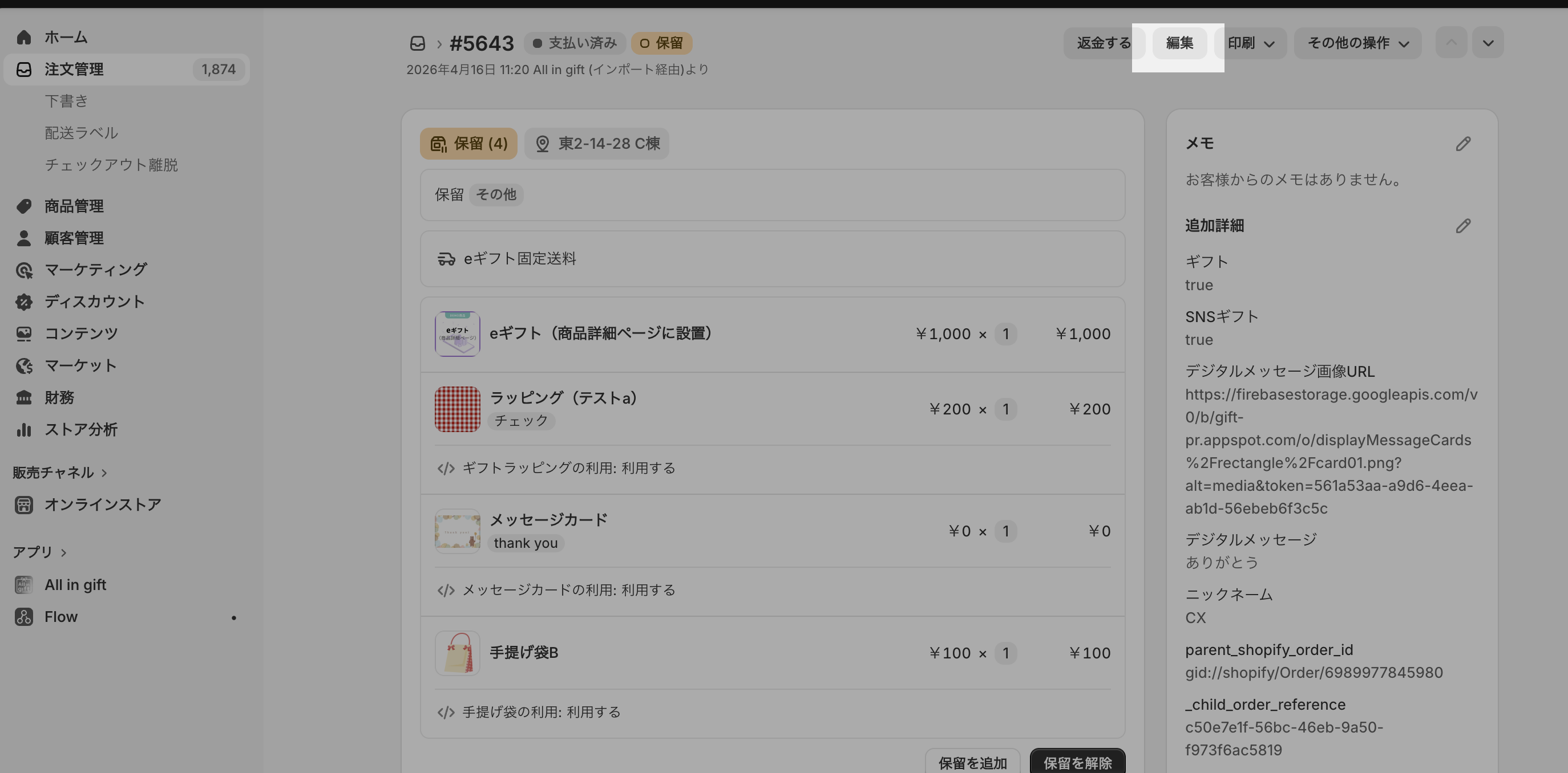 Shopify管理画面 > 注文管理 > 該当の注文詳細 > 編集 をクリックする