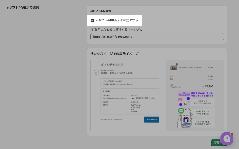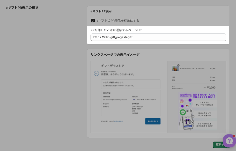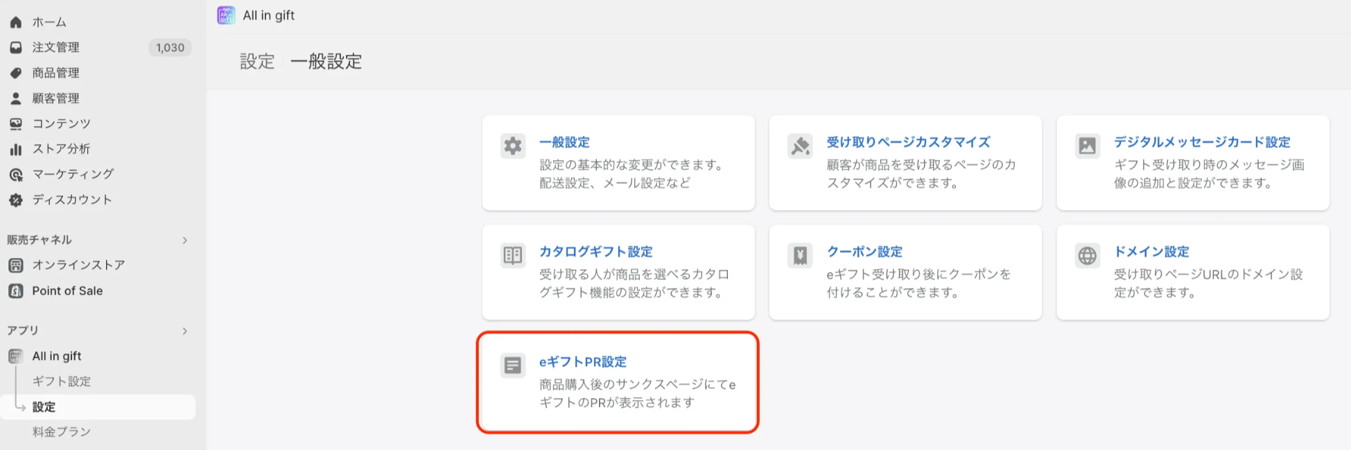 アプリ > All in gift > 設定 > eギフトPR設定 をクリックする