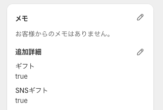 All in giftアプリを経由して作成された注文では、注文詳細画面の「追加詳細(note attributes)」にギフトおよびSNSギフトというKeyにtrueというvalueが自動的に付与されます。