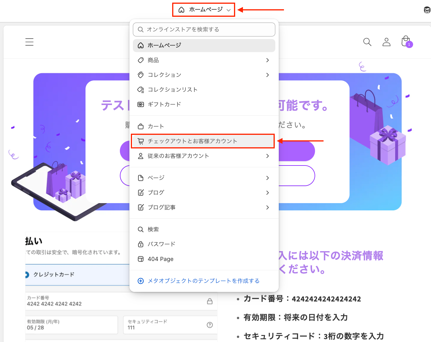上部の「ホームページ」をクリック > チェックアウトとお客様アカウント を選択