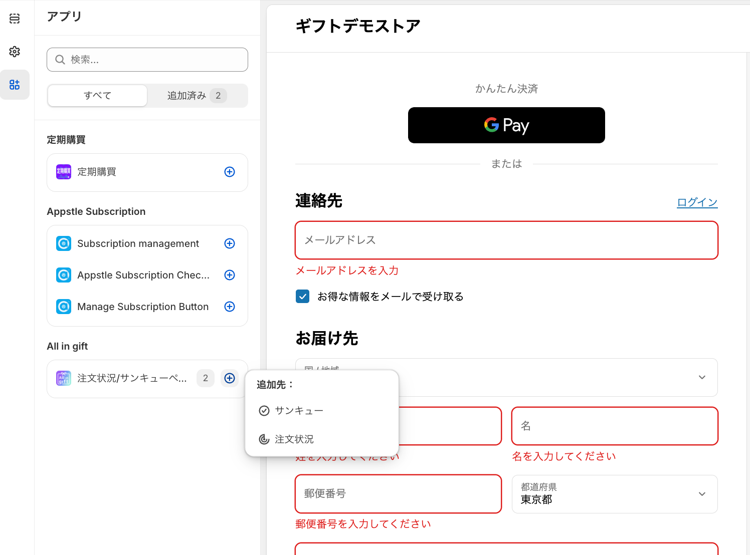 AllAll in gift gift in giftの右側にある「+」ボタンをクリックし、「サンキューページ」「注文状況ページ」をそれぞれクリックして追加