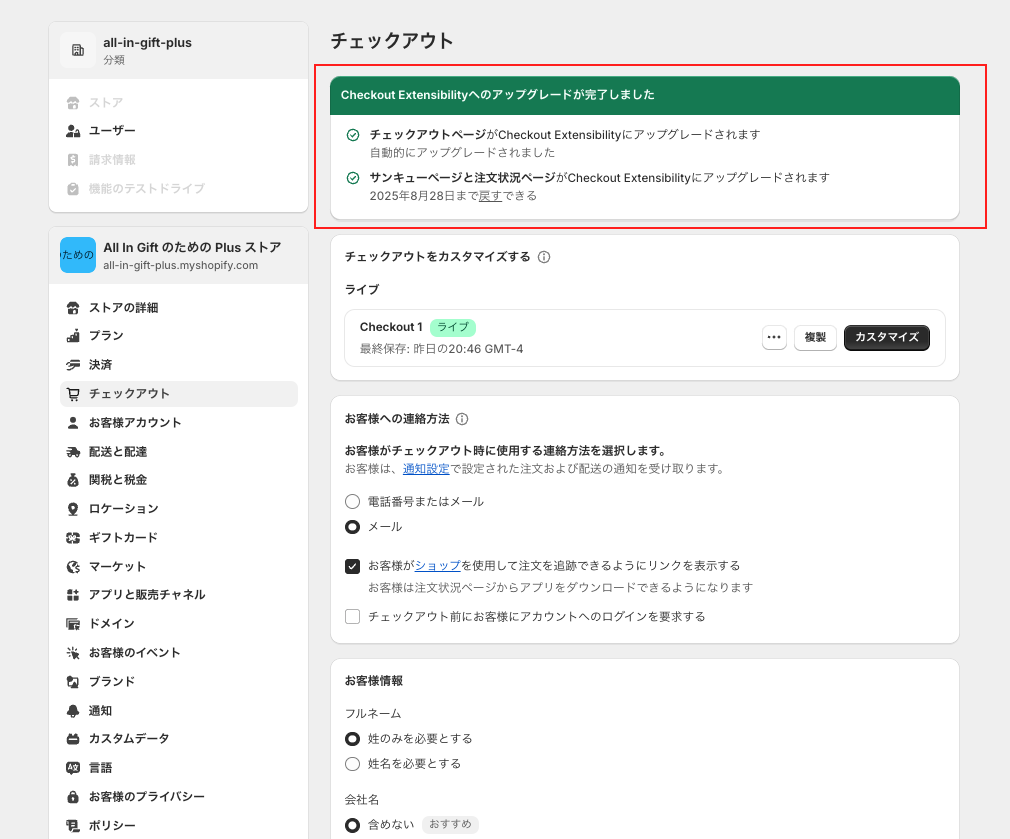 Shopify管理画面 > 設定(左下の歯車) > チェックアウト より、現在のチェックアウト環境を確認できます。