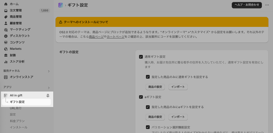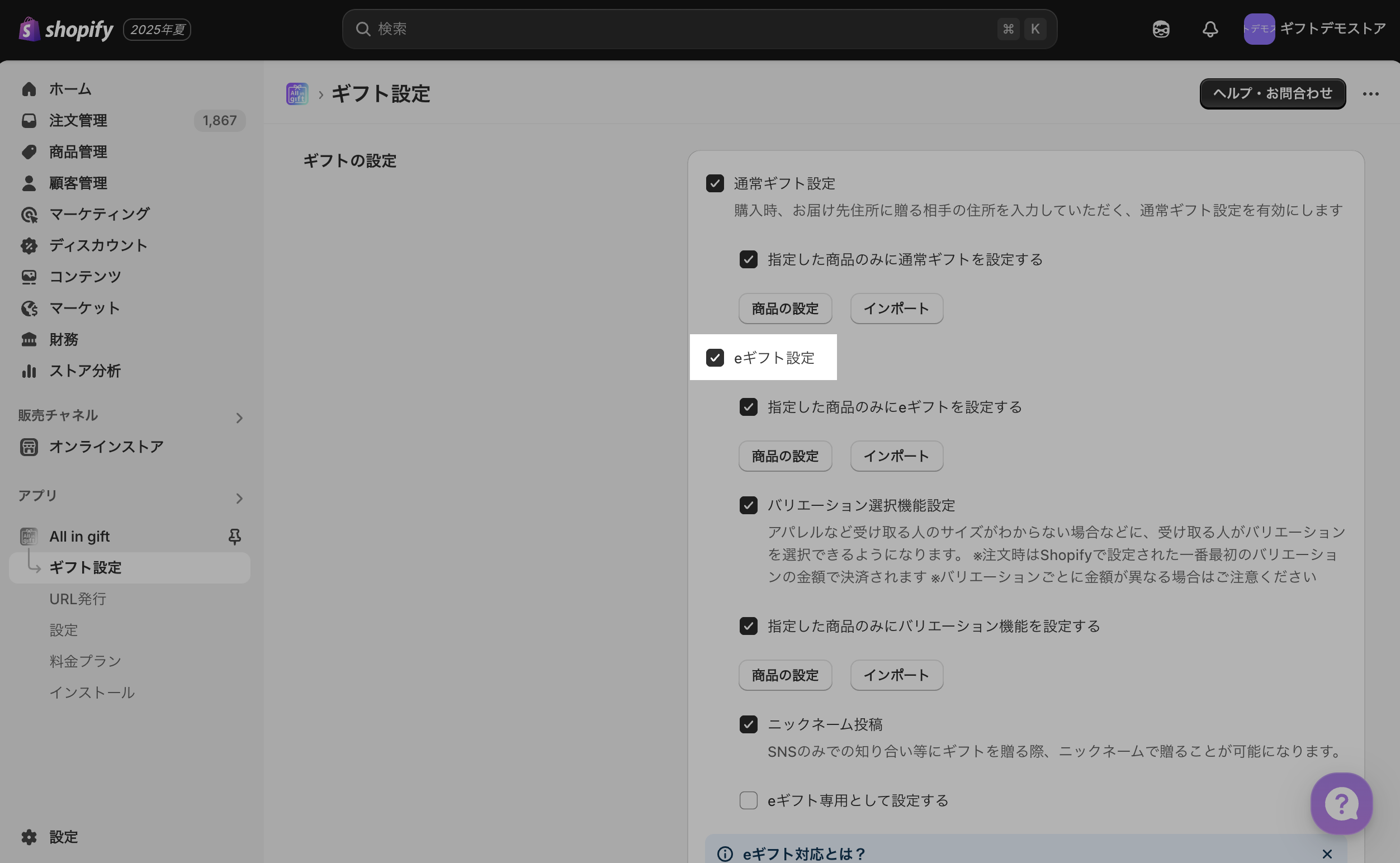 eギフト機能を有効化する設定方法です。