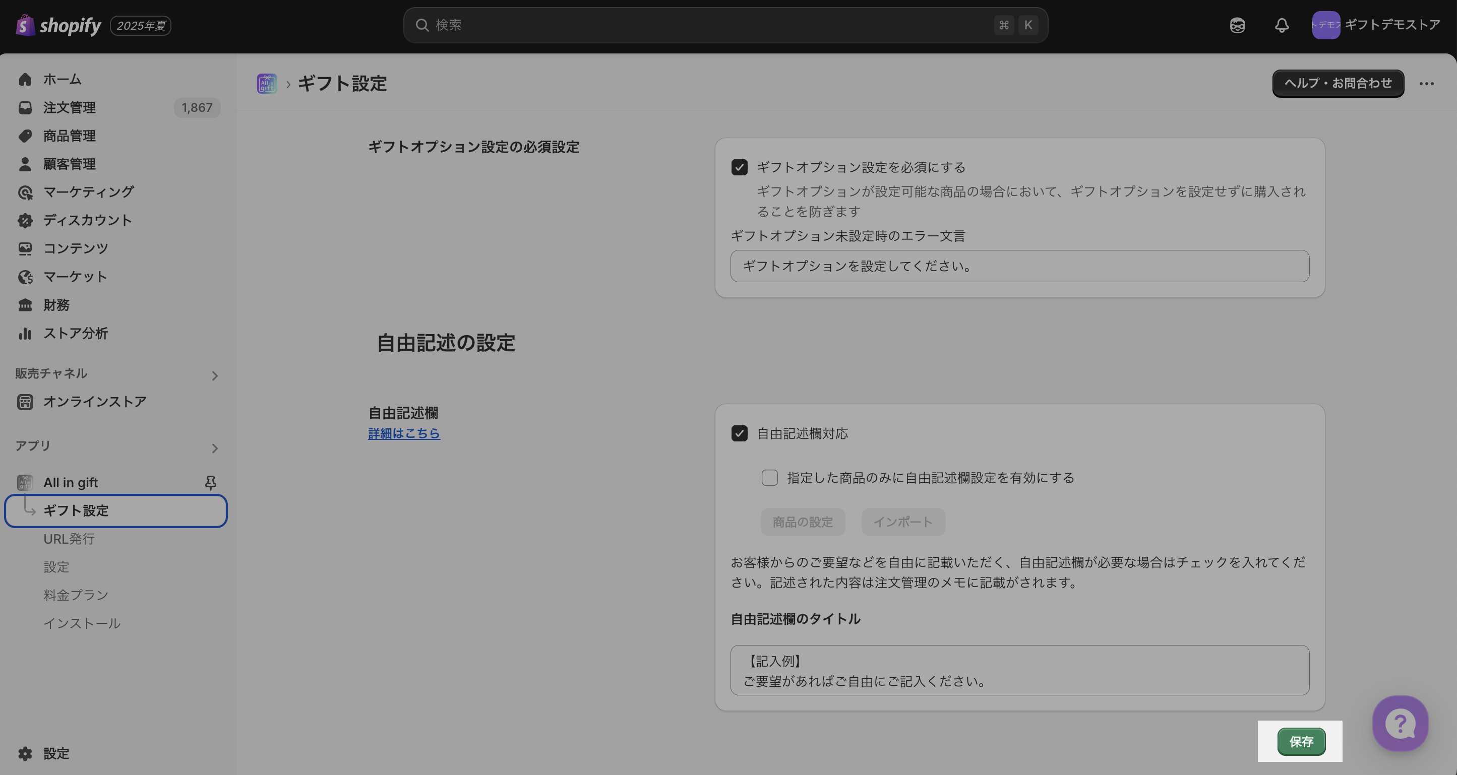 指定した商品のみに〇〇ギフトを有効にする>商品の設定から対象商品を選択をクリックする保存をクリックして完了です