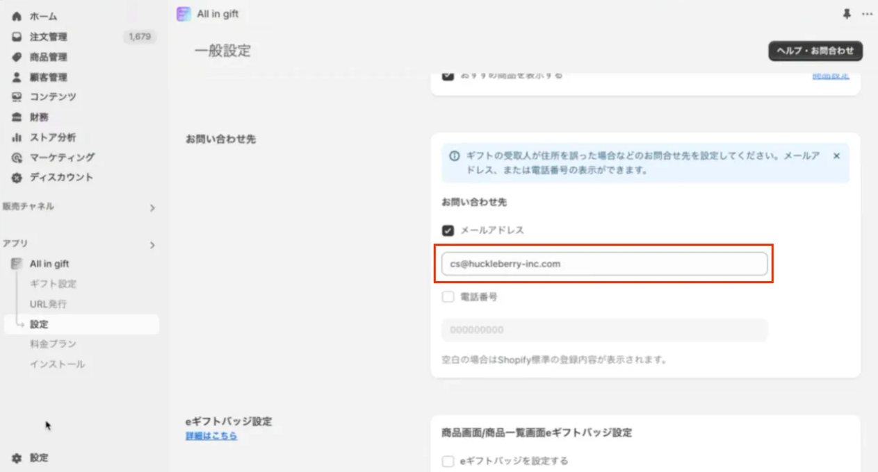 Shopify管理画面 > アプリ > All in gift > 設定 > eギフトのメール設定に進む