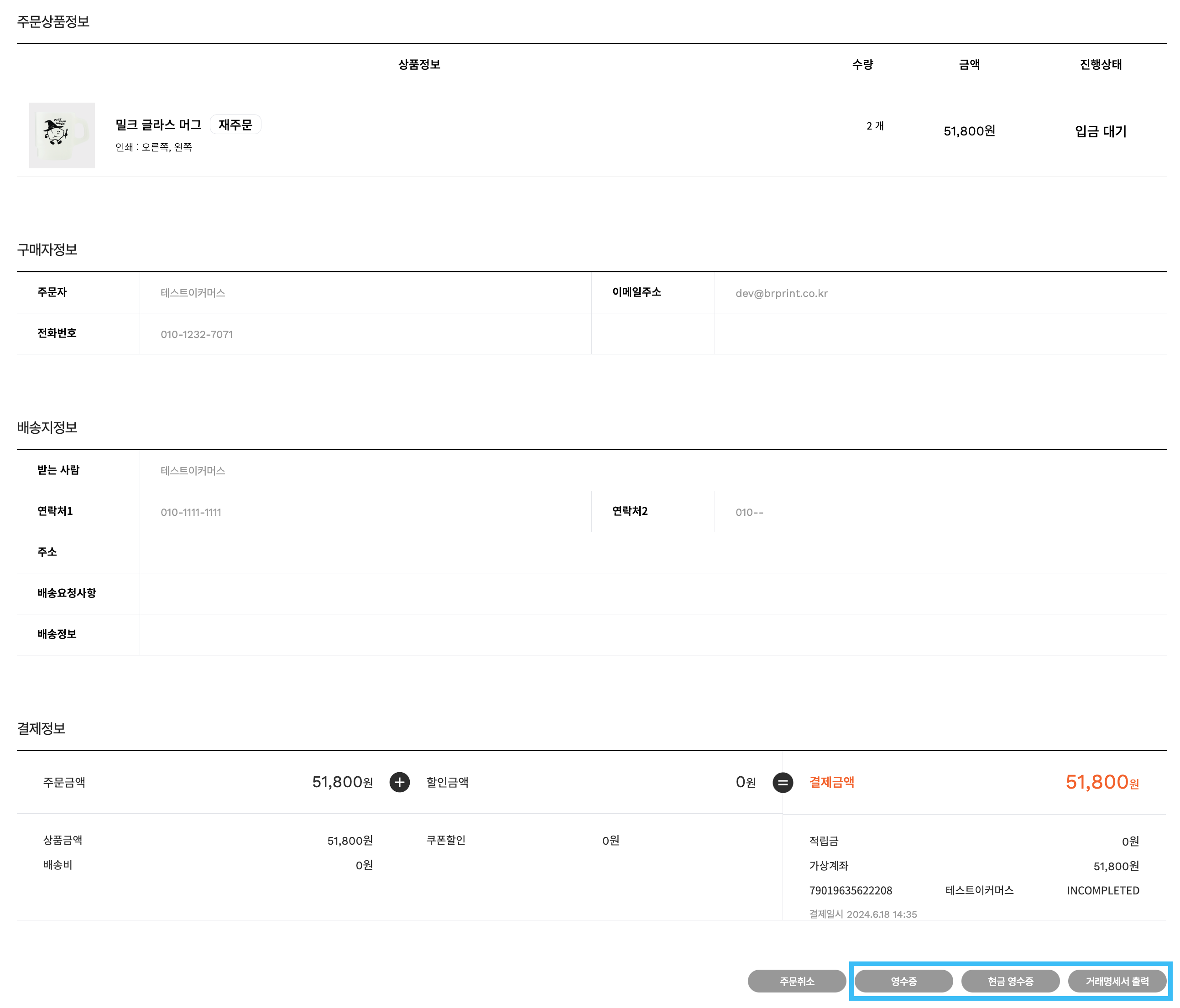 거래명세서·영수증: 로그인 후 [주문/배송] > 해당 주문 내역에서 직접 출력 가능합니다.