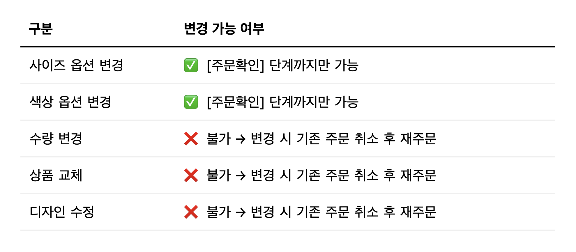 수량 변경, 상품 교체, 디자인 수정은 모두 불가하며, 필요한 경우 기존 주문을 취소한 뒤 새로 주문해 주셔야 합니다.