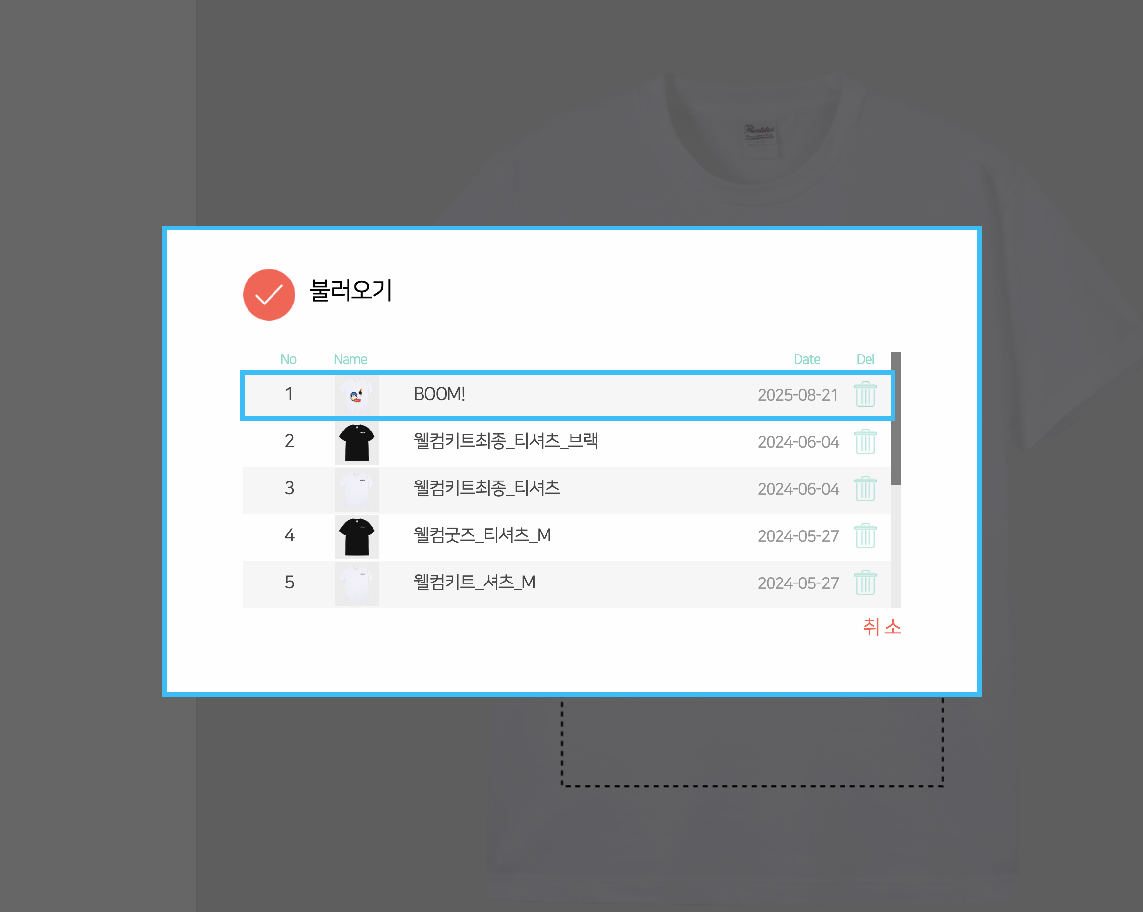 β’ μ¬μ£Όλ¬Έν λλ [λΆλ¬μ€κΈ°] κΈ°λ₯μμ μ μ₯λ λμμΈμ μ νν΄ μ£ΌμΈμ.