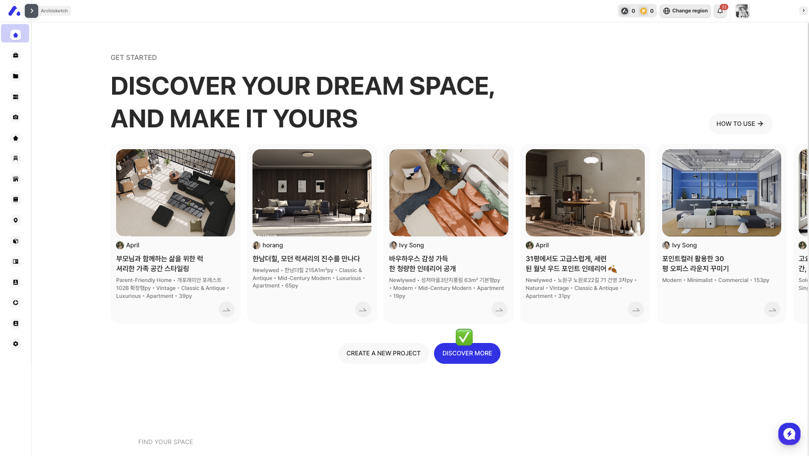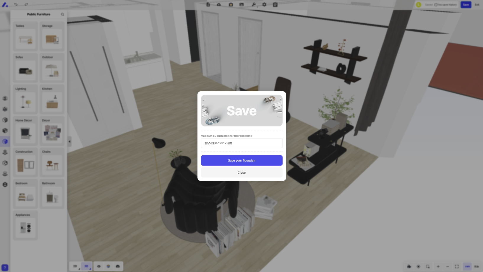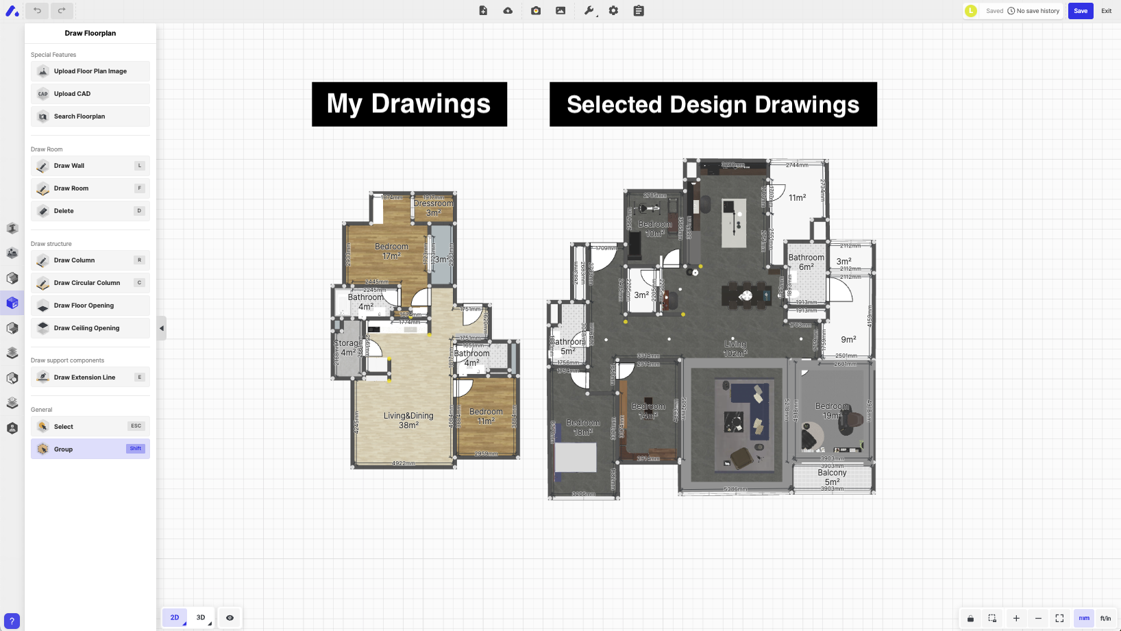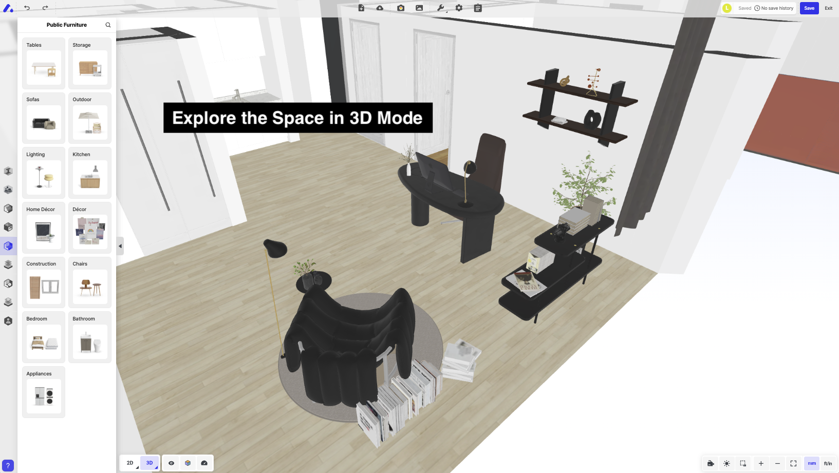 With the floor plan and design side-by-side, you can easily pick furniture or elements and transfer them into your space.