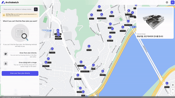 In the map service, you can use the 3D mini-map in the top-right corner to locate your home while previewing the selected design side-by-side.