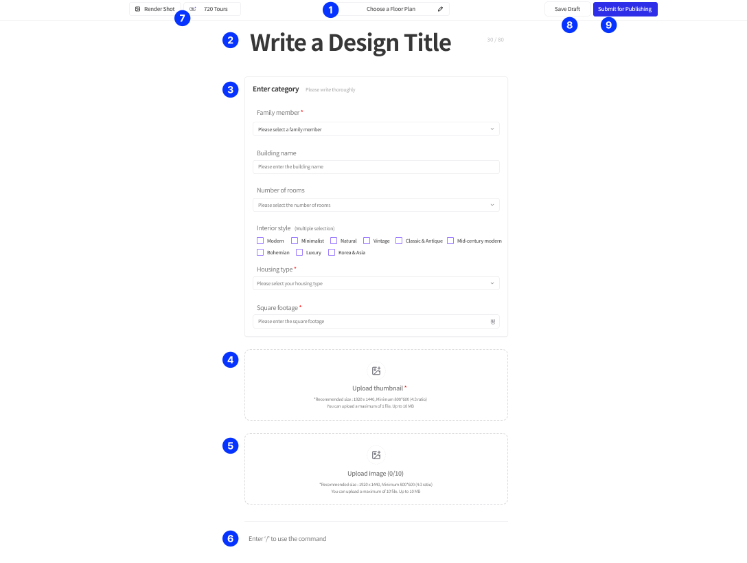 Select the floor plan for the project you want to publish. You can easily work with 3D plans, 720-degree tours, and rendered images right in the editor.