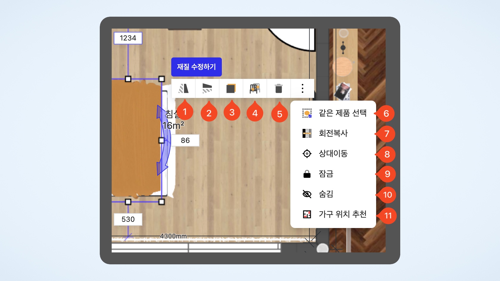 에디터에서 가구를 배치하면 가구의 우측에 툴바(Tool Bar)가 나타납니다. 툴바를 활용하면 다양한 편리한 기능을 쉽게 이용할 수 있어요. 하나씩 살펴볼게요.