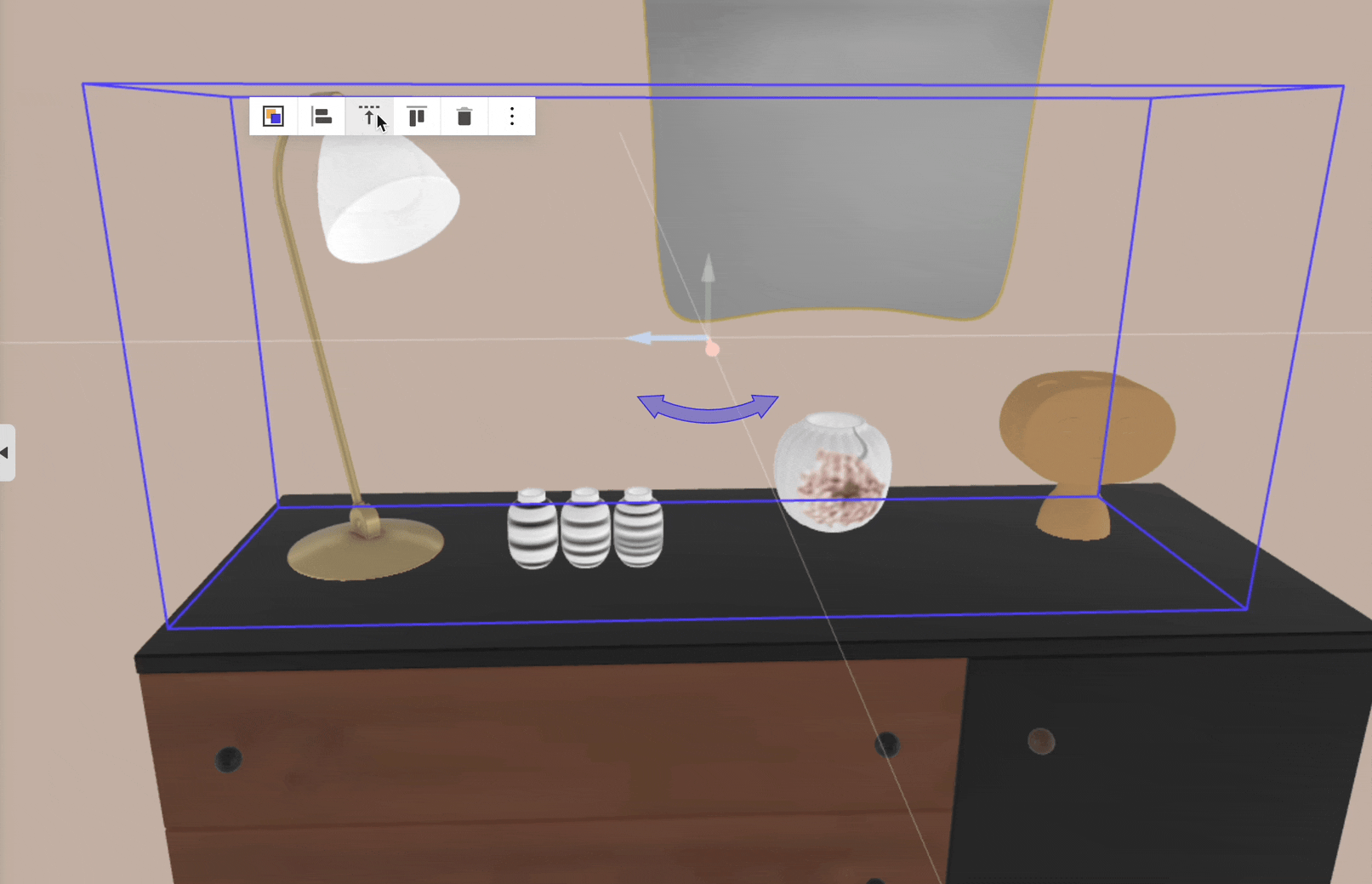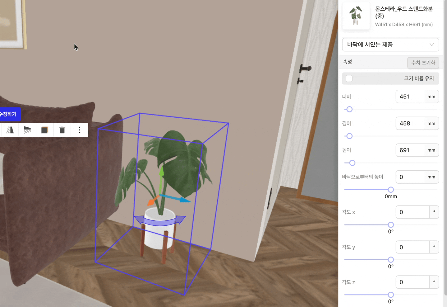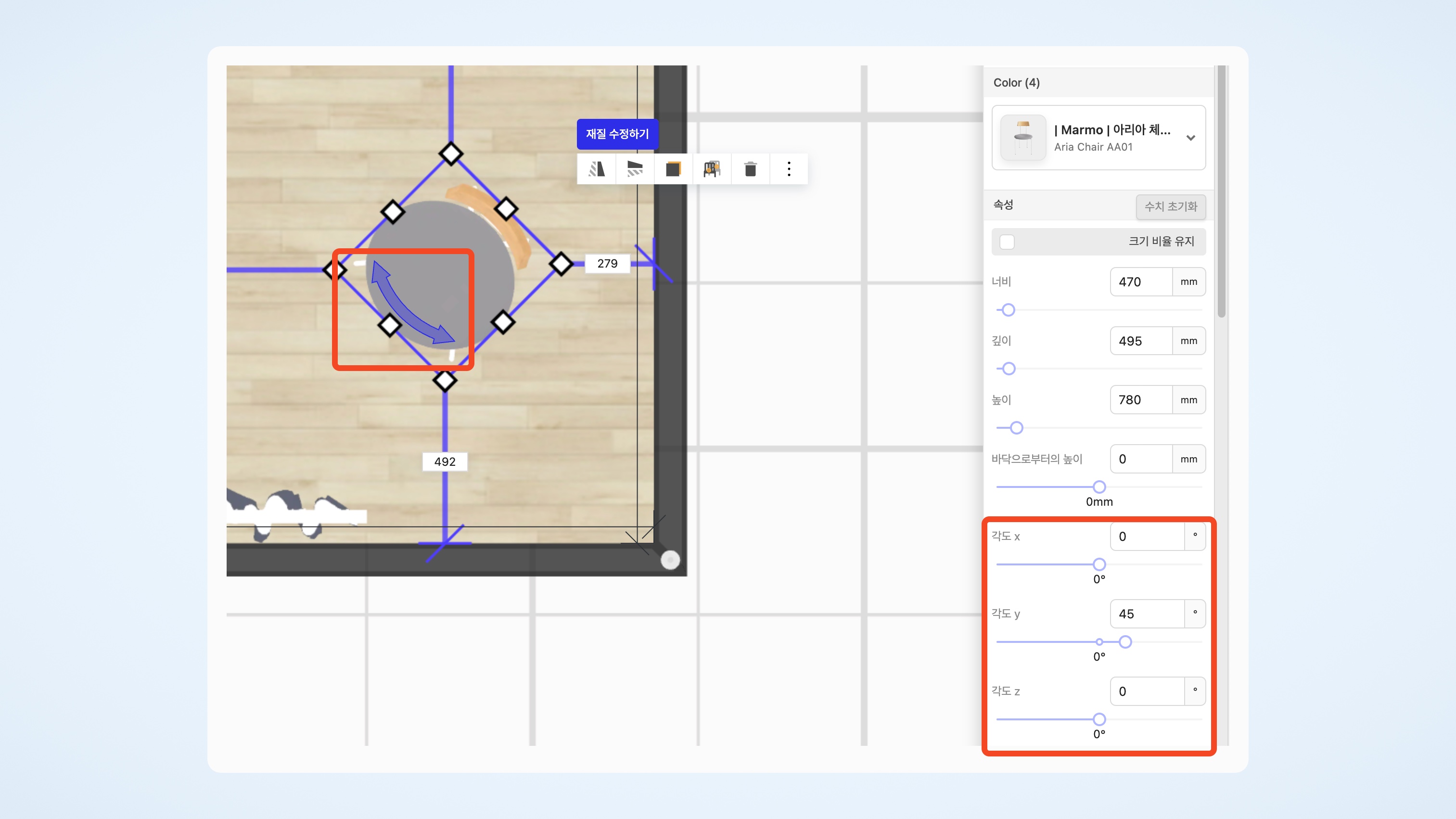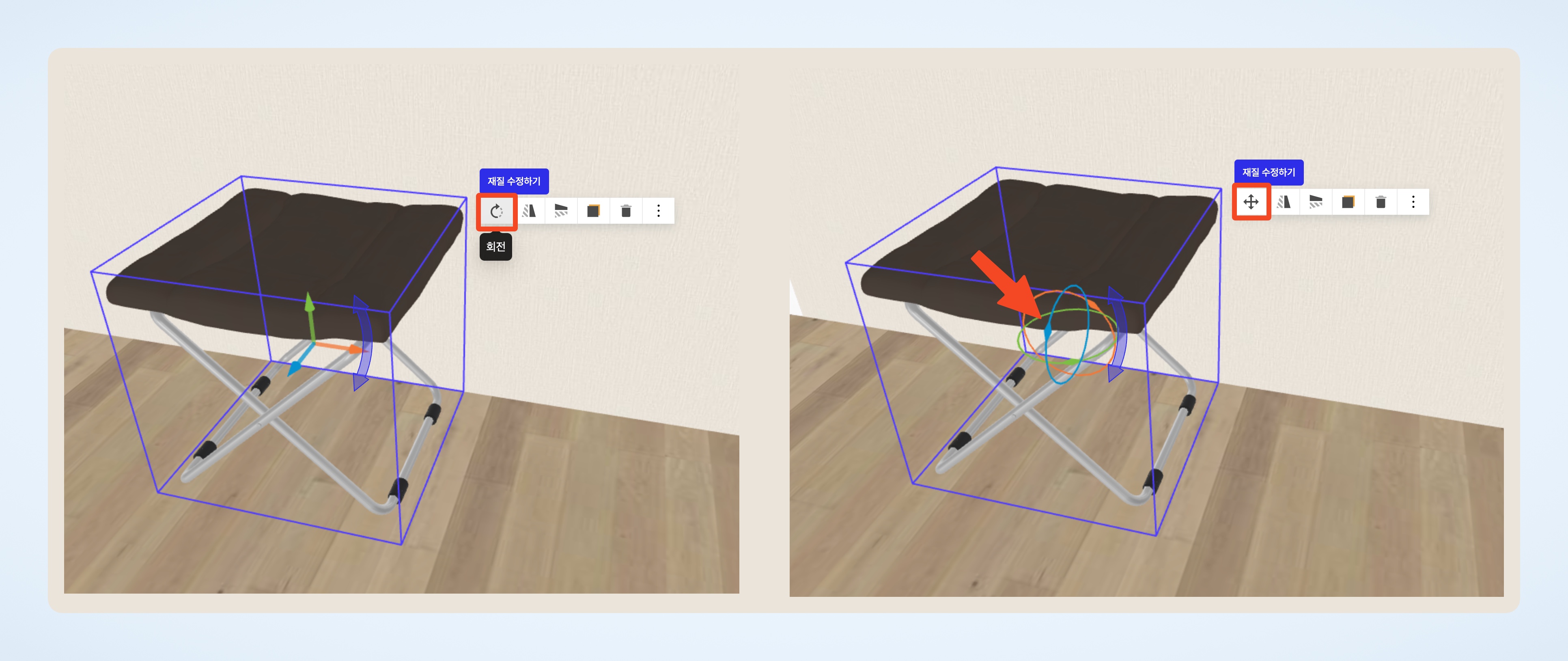 제품을 클릭하면 나타나는 툴바에서 [회전] 아이콘을 한 번 클릭하면, 회전 축이 표시되어 원하는 방향으로 회전시킬 수 있어요. 회전 축을 직접 드래그하여 각도를 조정하거나, 우측 상세 정보에서 회전 값을 직접 입력할 수도 있습니다. 회전 아이콘을 다시 클릭하면 회전 모드가 종료되고, 원래의 이동 모드로 돌아갑니다.