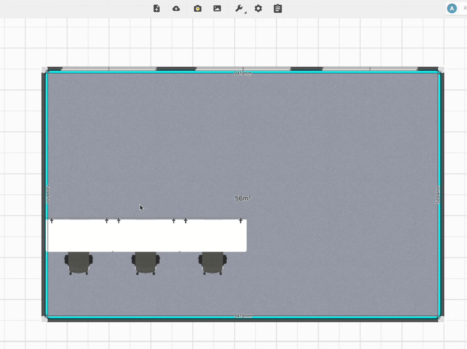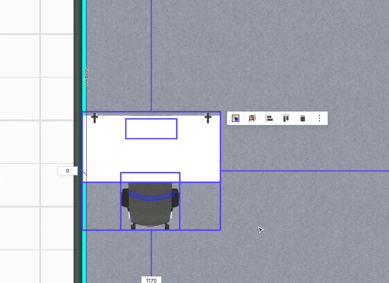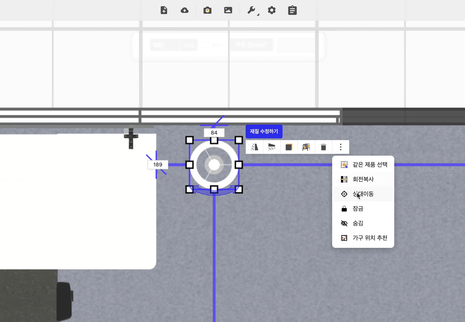 가구를 클릭했을 때 뜨는 툴바에서 복사 버튼을 클릭 후 원하는 위치에 한 번더 클릭하면 복사된 제품이 배치됩니다. (Ctrl + C / V 를 이용해서 복사, 붙여넣기 하는 것도 가능해요.)