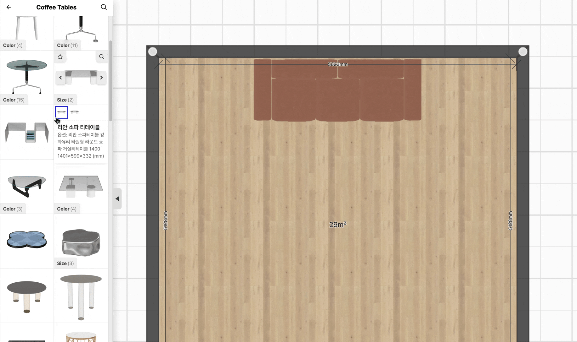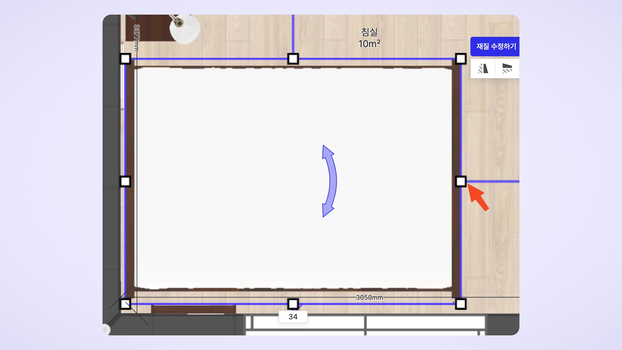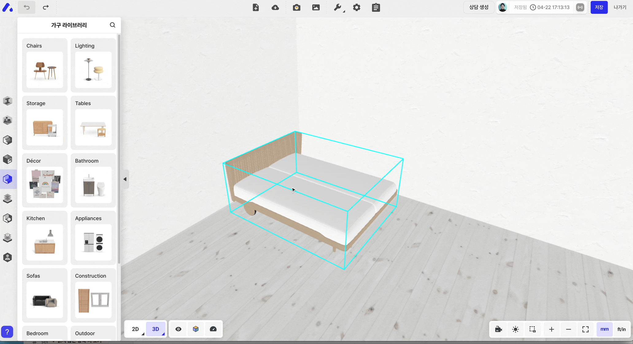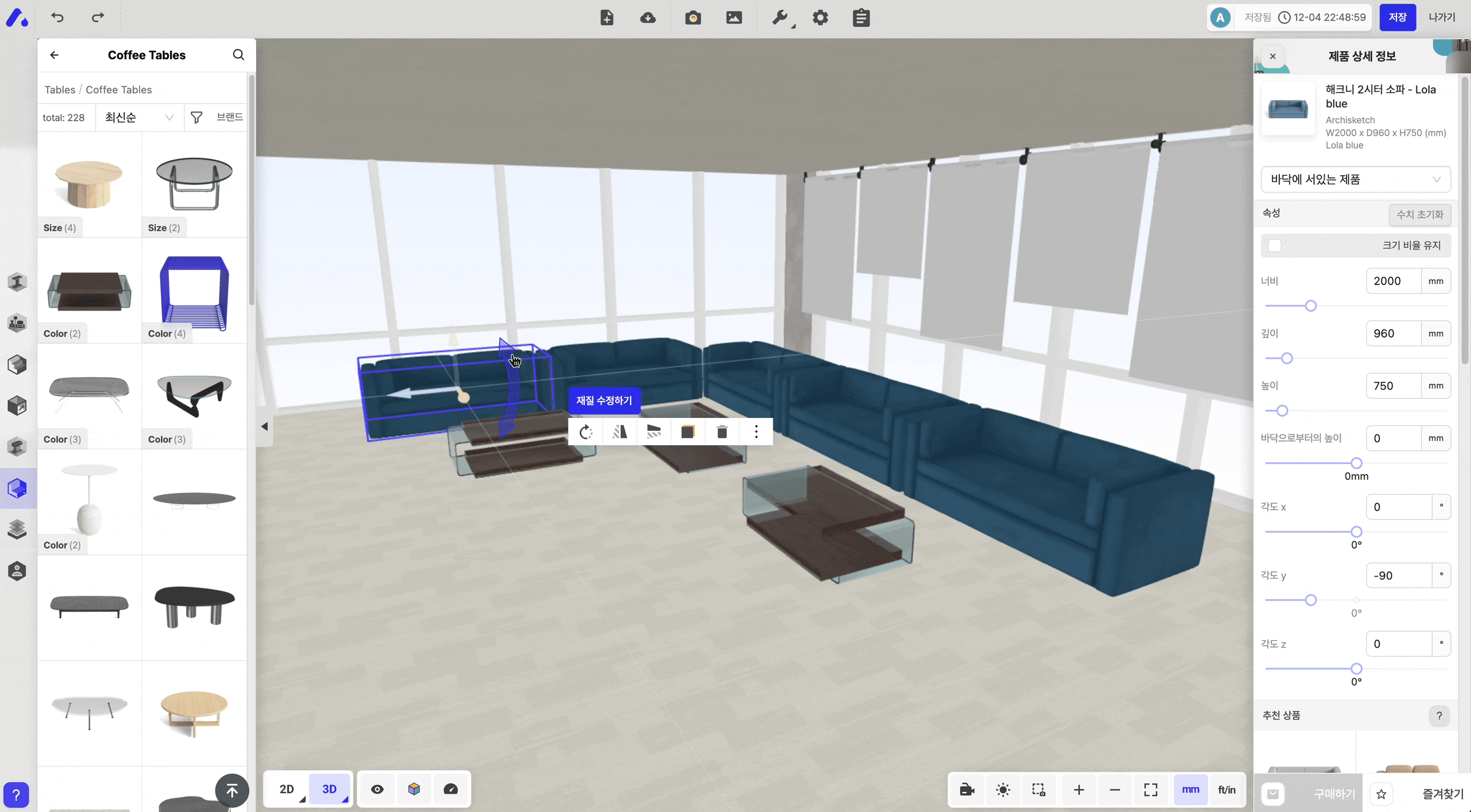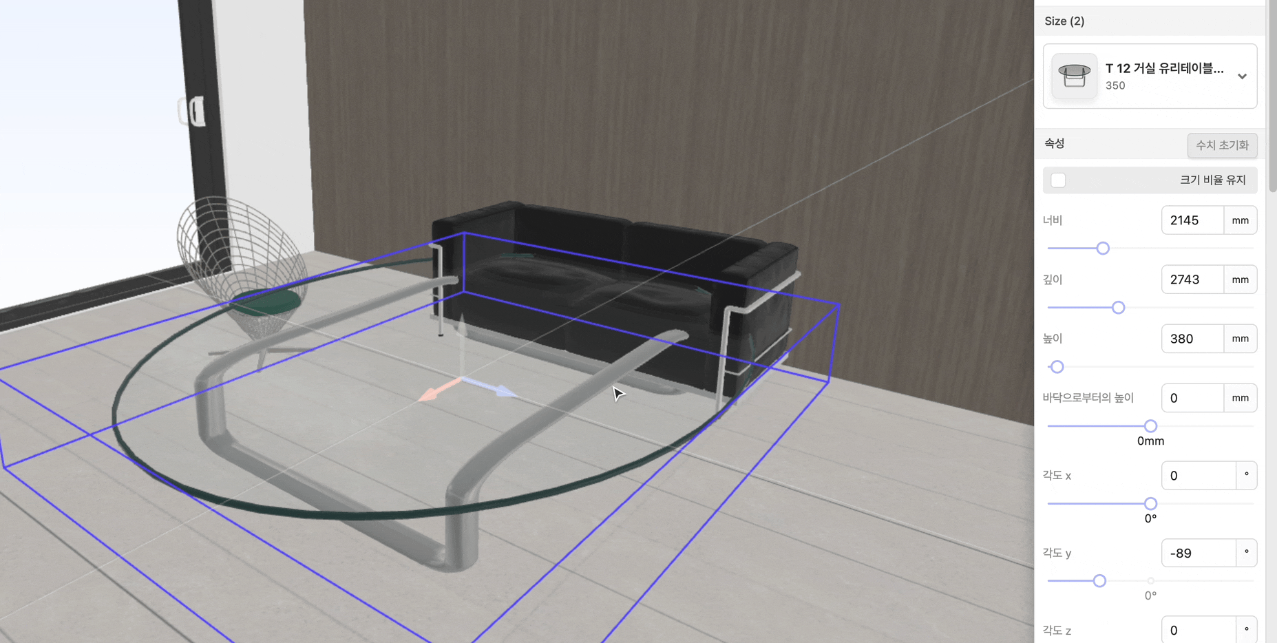 배치한 가구의 크기를 조절하고 싶다면 제품의 바운딩 박스(Bounding Box)를 사용하여 조절하는 방법과, 우측의 제품 상세 정보에서 조절하는 방법 2가지가 있습니다.