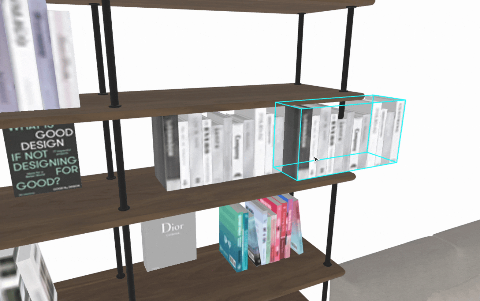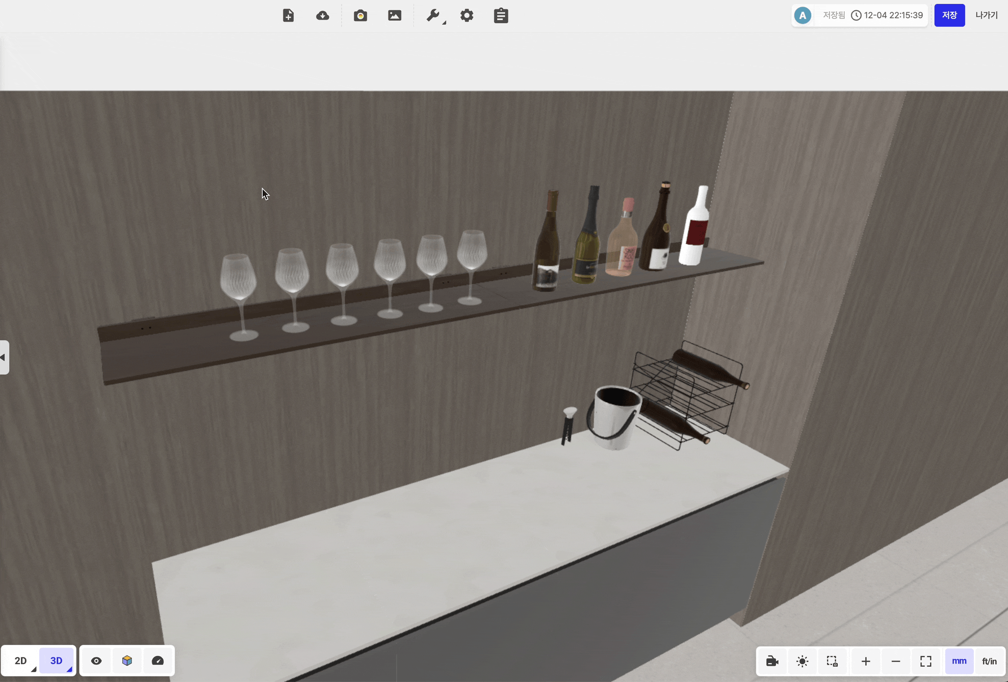 책장처럼 중간 부분에 물건을 올리거나, 제품 상판이 낮아 배치가 어려운 경우에는 은선모드를 활용해 보세요. 에디터 하단의 [디스플레이 모드 - 은선모드]를 켜면, 제품의 외곽 면들이 선으로 표시되어, 다른 제품과의 접합 부분을 쉽게 확인할 수 있습니다. 이제 초록색 화살표를 드래그해서, 다른 제품의 면에 정확하게 맞춰 배치하면 됩니다.