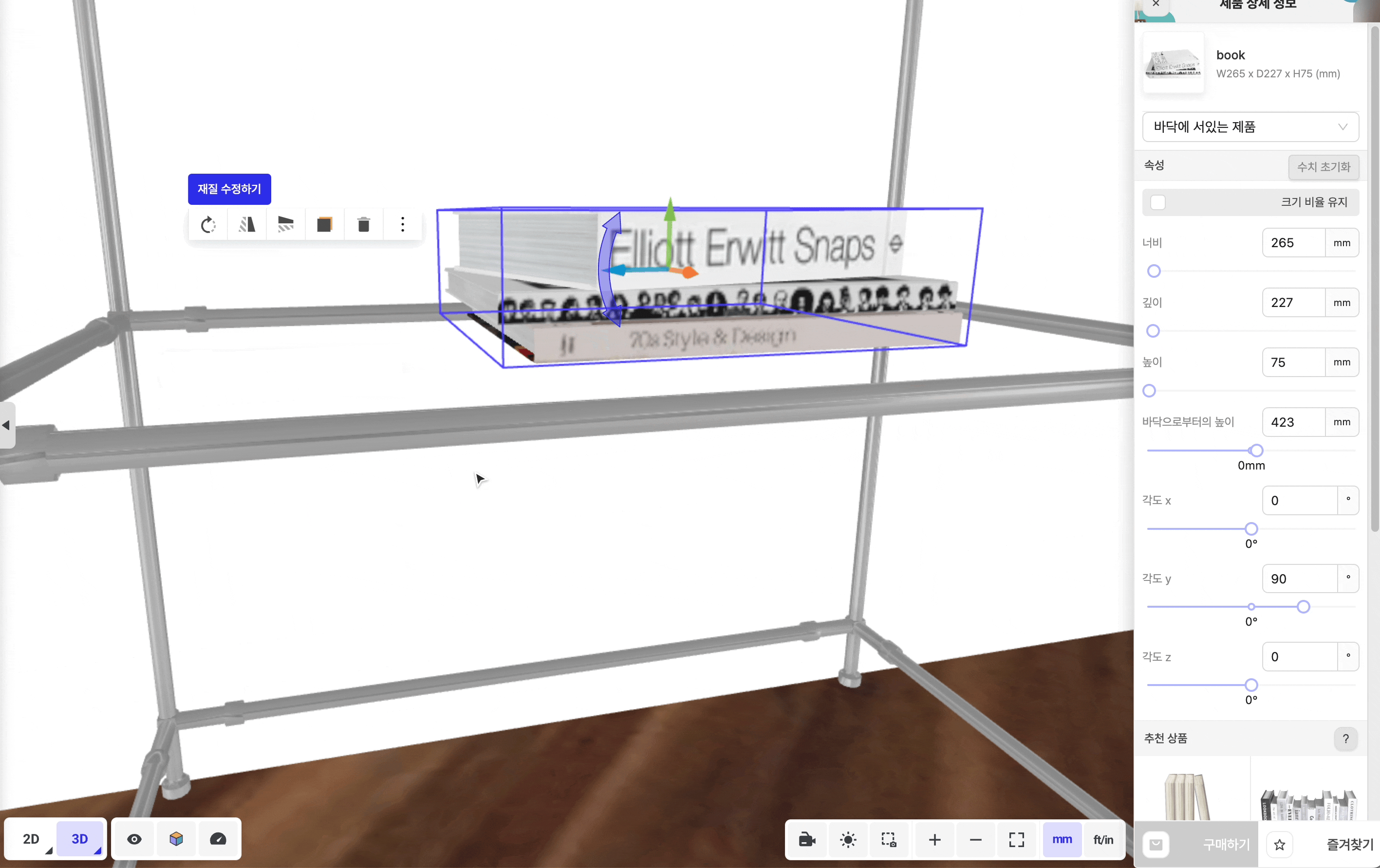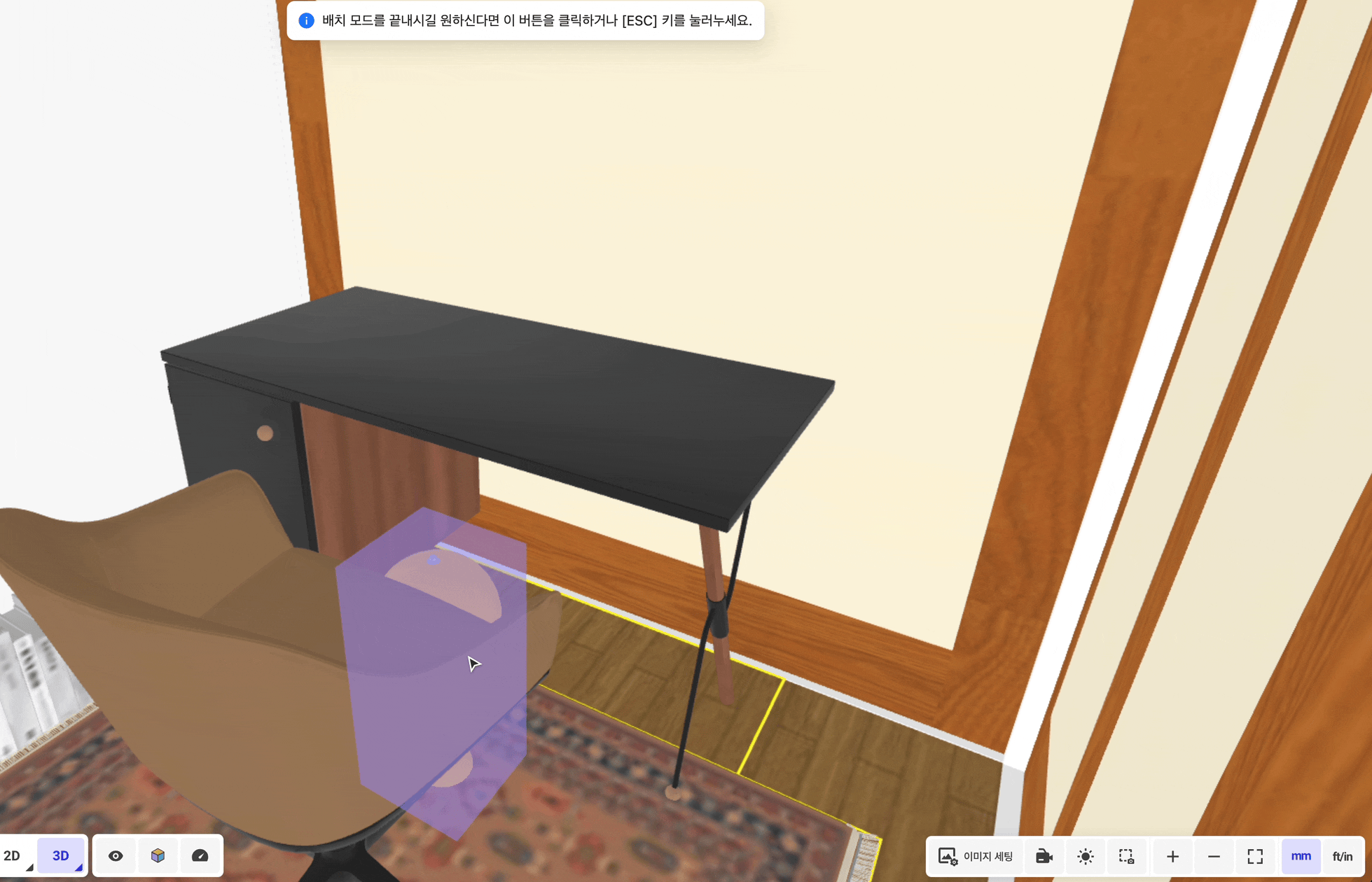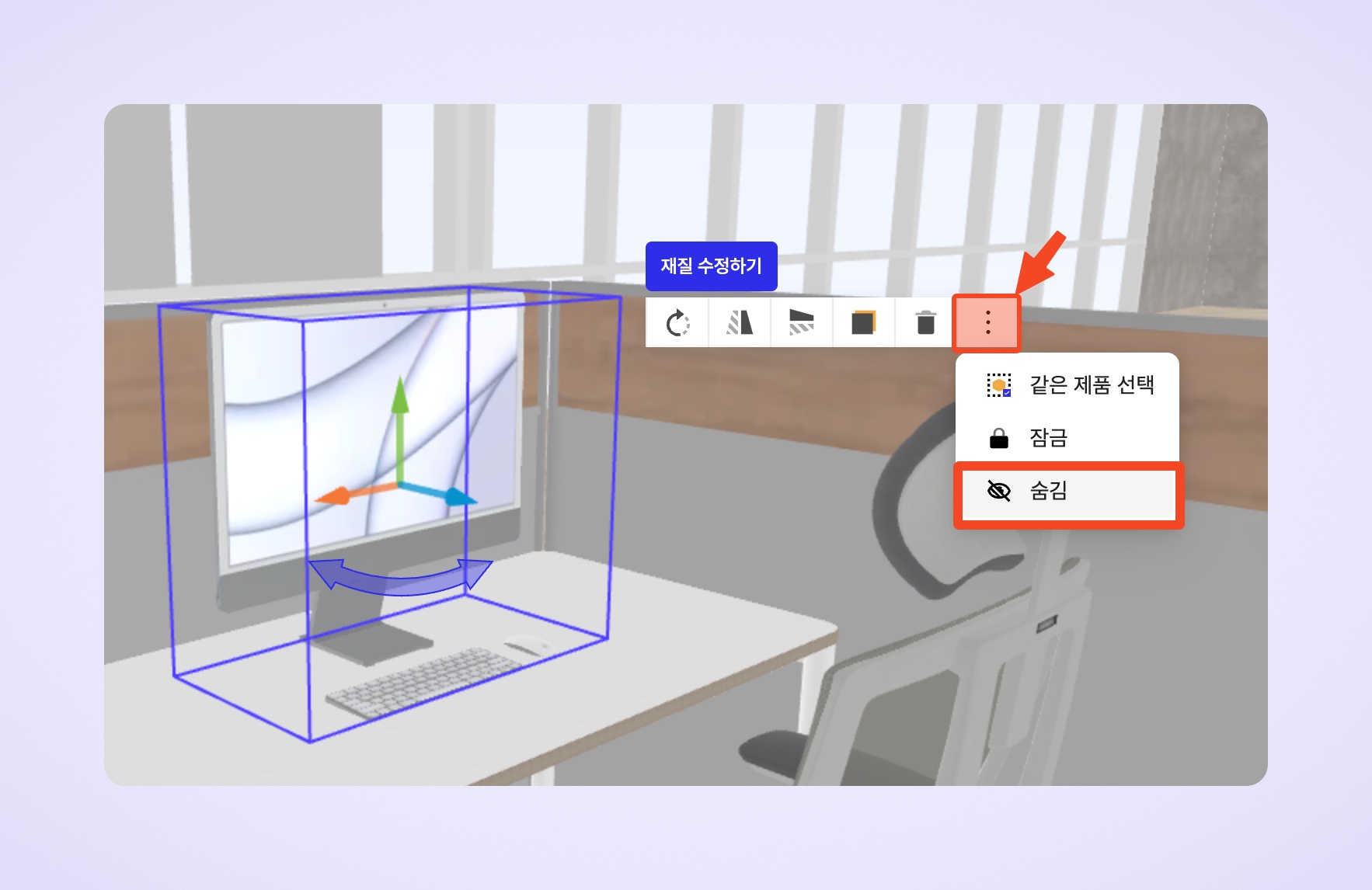 3D 모드에서는 이동할 제품을 클릭하면 3색 축이 나타나요. 축을 잡고 끌면 해당 축 방향으로만 이동할 수 있고, 축이 아닌 곳을 잡고 이동하면 자유롭게 움직일 수 있어요.