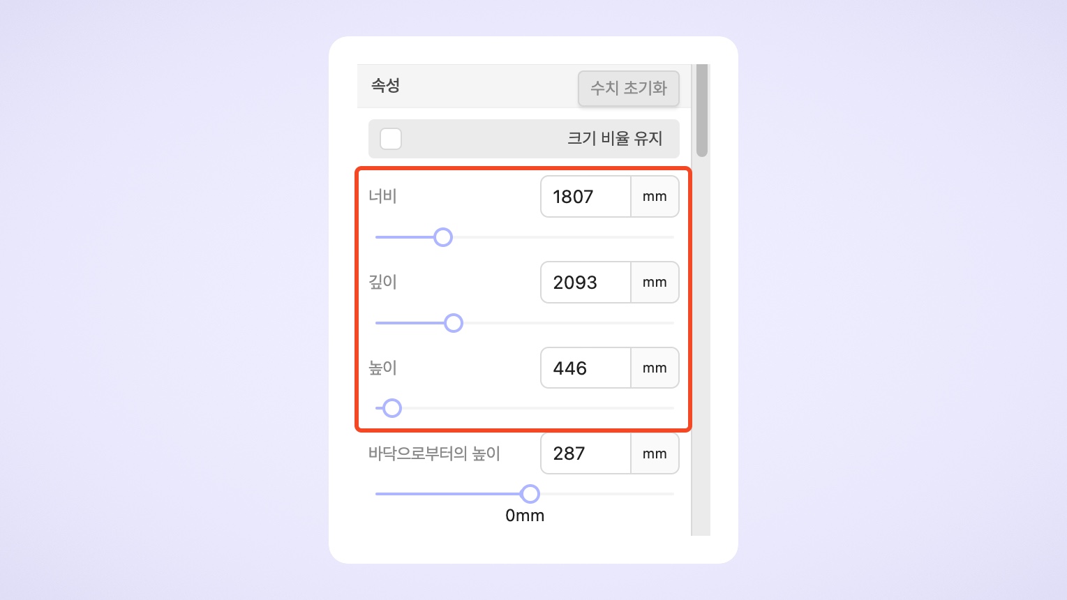 크기 비율 유지 체크박스를 선택한 상태에서 너비, 깊이, 높이 중 하나의 크기를 변경하면, 나머지 속성도 비율에 맞춰 자동으로 변경됩니다.