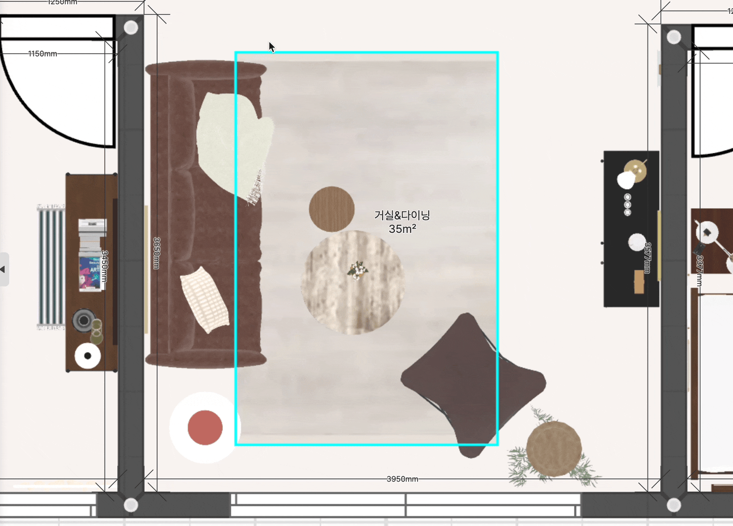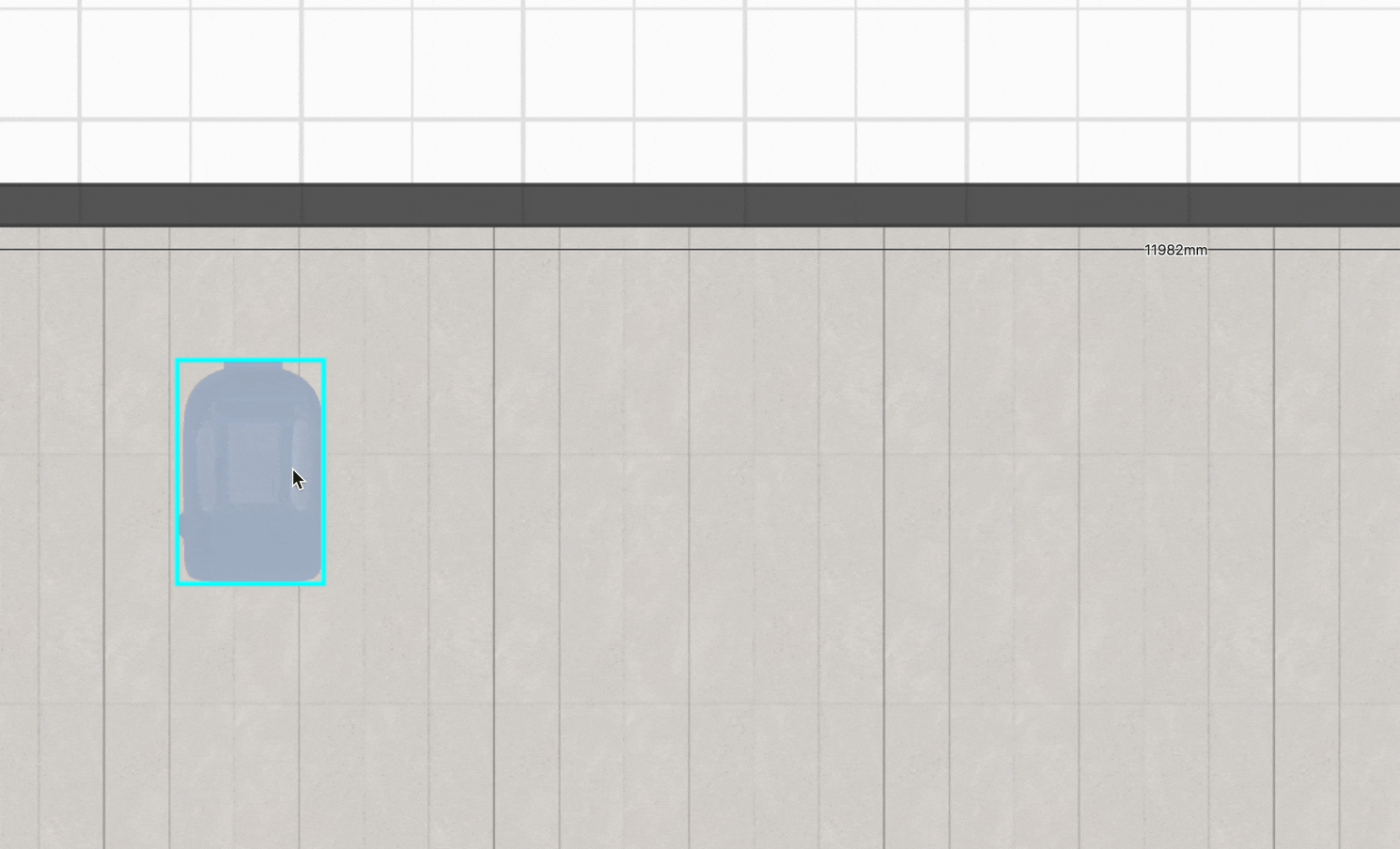 배치한 가구를 이동시키려면, 제품을 클릭한 상태에서 원하는 위치로 드래그한 후 마우스를 놓으면 됩니다. 이때 노란색 가이드 라인이 활성화되며, 스냅 기능이 작동해 제품이 자동으로 정렬됩니다. 제품 간 또는 벽과의 간격을 맞추는 데 유용합니다.