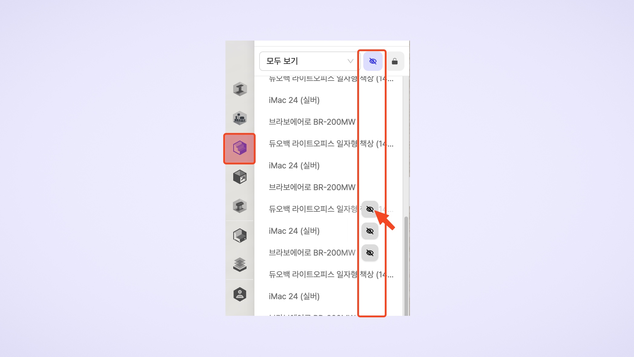 숨김 처리한 가구를 다시 보이게 하려면, [층 관리]에서 해당 아이콘을 클릭한 후 눈 모양 아이콘을 선택하면 됩니다.