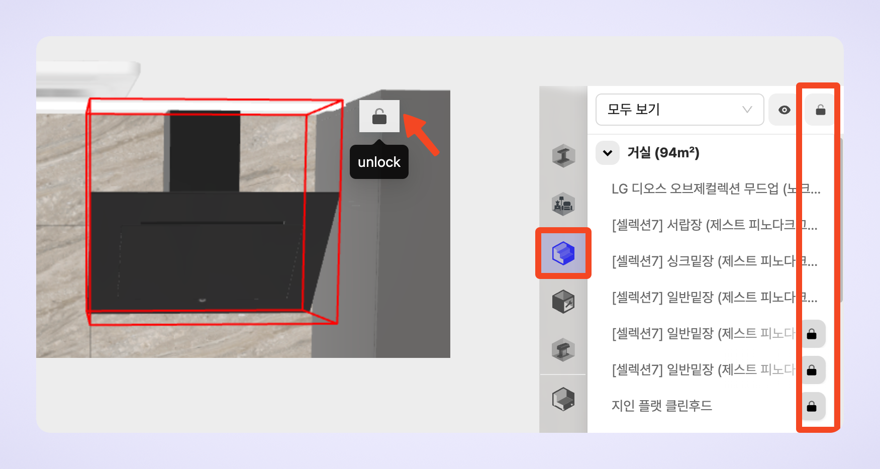 [층 관리] 탭에서 잠금 처리된 제품을 선택해 잠금 해제할 수 있습니다.
