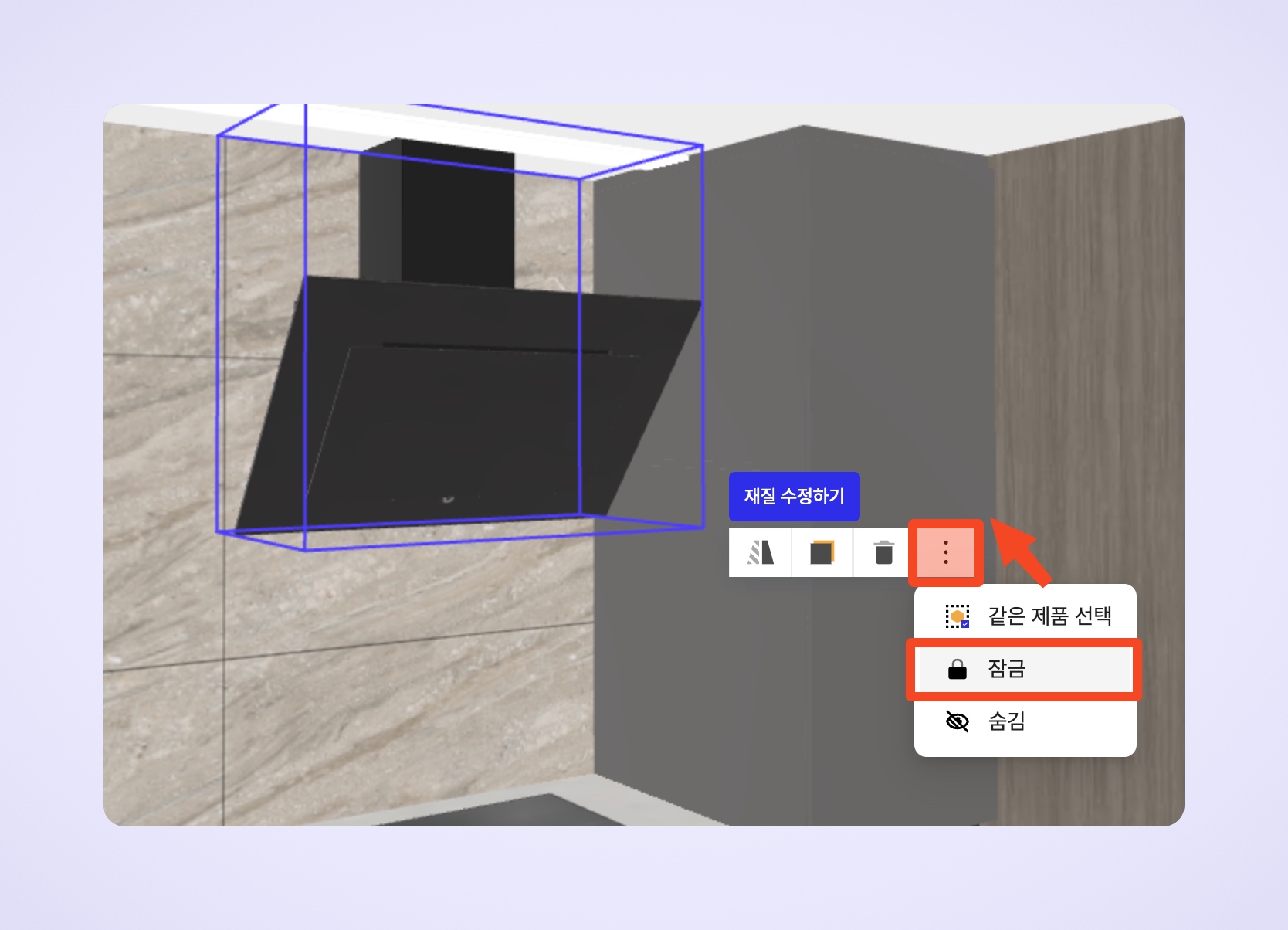가구를 잠금 처리하면 해당 가구는 선택에서 제외됩니다. 고정시켜두고 싶은 가구를 잠금 처리해 두면, 더 수월하게 공간을 배치할 수 있습니다.잠금을 원하는 가구를 클릭한 후, [더보기 - 잠금]을 누르면, 바운딩 박스가 빨간색으로 변경되며 잠금 아이콘이 표시됩니다.