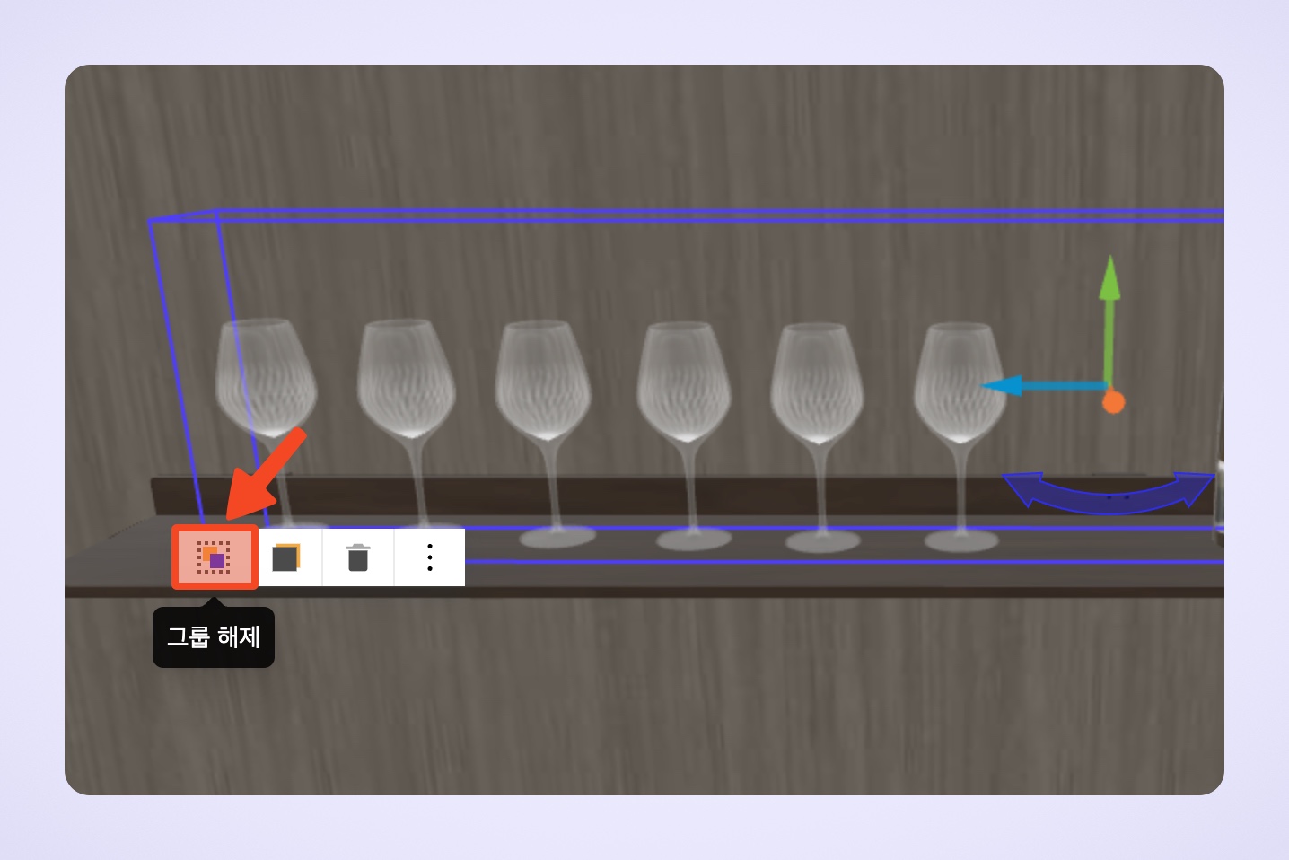 여러 제품을 그룹화하면 한 번에 관리할 수 있어요. 원하는 제품을 다중 선택한 후, 툴바에서 [그룹화] 버튼을 클릭하면 제품들이 하나의 그룹으로 묶입니다. 이제 이 그룹을 한 번에 이동하거나 회전시킬 수 있어요.