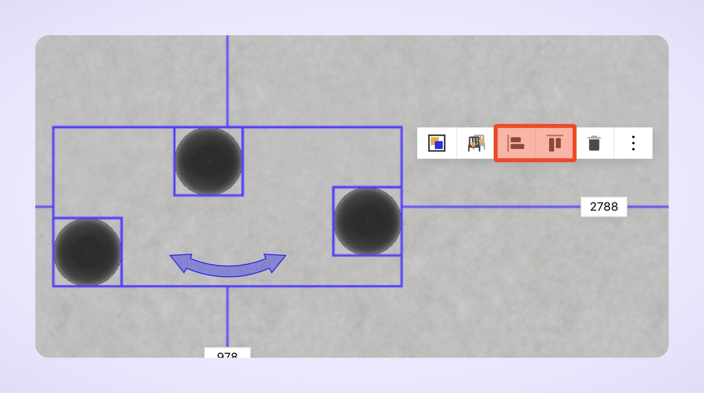 정렬은 2D/3D 모드에서 모두 사용할 수 있습니다. 가구를 깔끔하고 쉽게 정렬할 수 있도록 도와주는 기능으로, 제품을 다중 선택하면 툴바에 정렬 아이콘이 나타납니다. 원하는 정렬 기능을 선택하여 적용하세요.