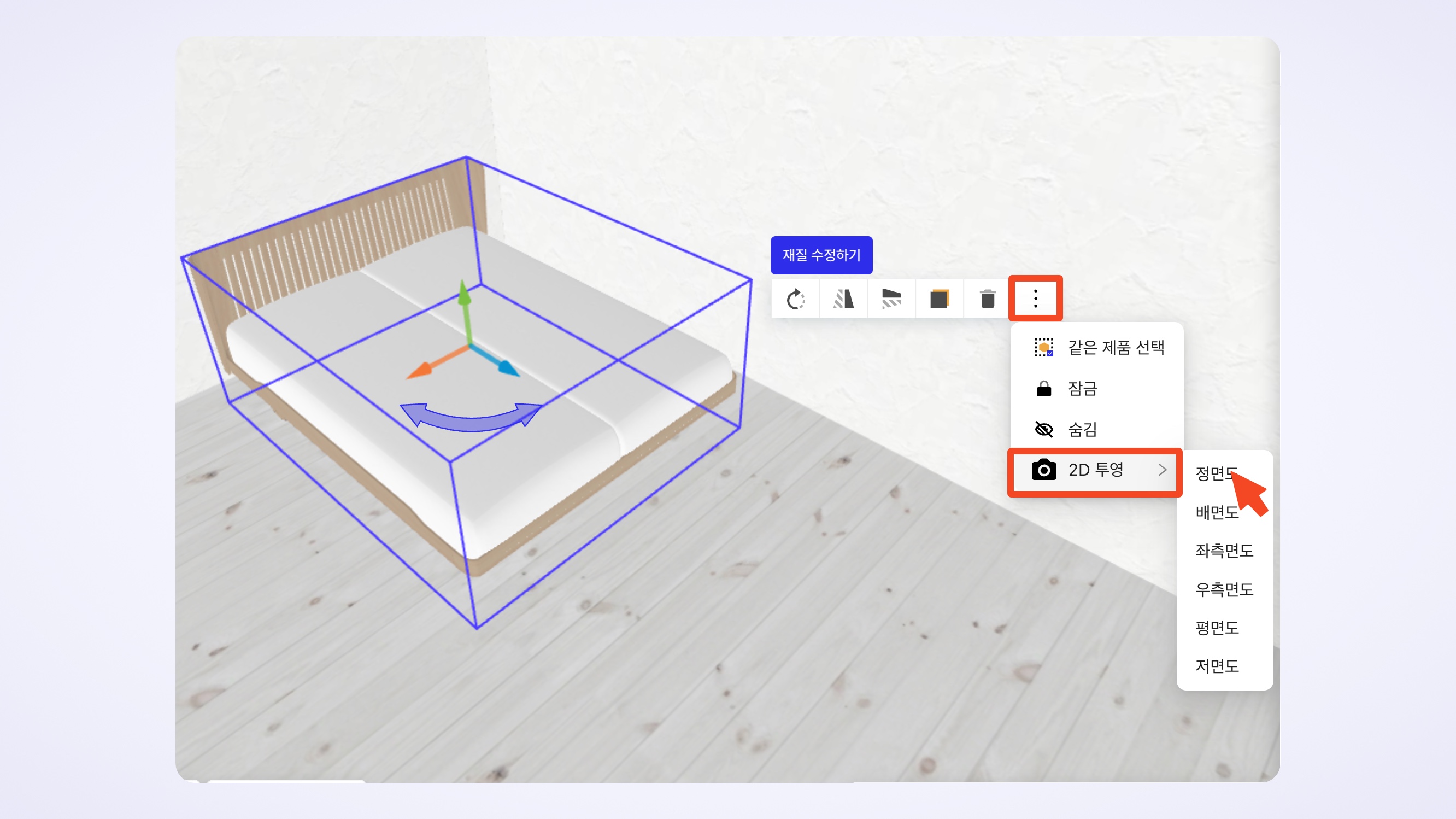 3D 모드에서 제품을 클릭한 후, [...] 더보기 버튼을 선택하면 2D 투영 기능을 사용할 수 있습니다. 이 기능은 제품을 6개의 기본 시점 (정면도, 배면도, 좌측면도, 우측면도, 평면도, 저면도) 중 하나로 자동 정렬해 보여줍니다.